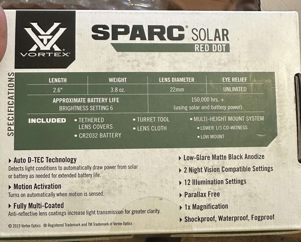 Vortex Optics SPARC Solar Red Dot Sight - 2 MOA Dot brand new in box