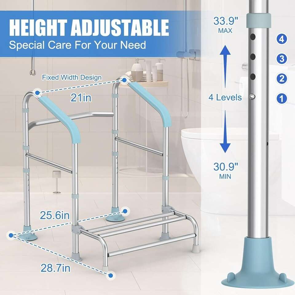 ADJUSTABLE HEIGHT: This non-slip toilet assist rails has four height adjustments and the easy-to-use adjustment design allows you to customize heights from 30.9 to 33.9 freely making it suitable for people of most heights without requiring multiple frames. Our sturdy elderly toilet support rails has a fixed width 21 inches that between the two handles making it perfect for most of toilets.