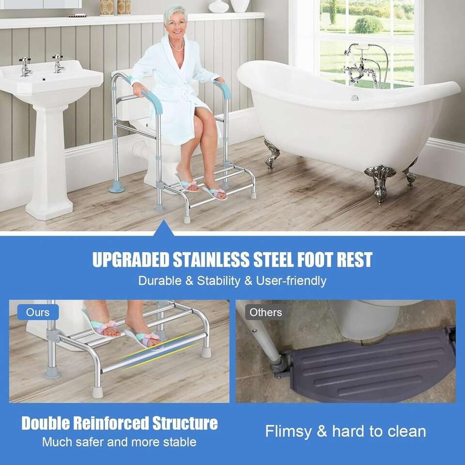 TOILET SAFETY RAILS WITH FOOT REST: UGarden upgraded toilet rails with footrest design which is locked within the frame making the toilet frame more supportive and stable during use helping users to sit and stand safely in the bathroom while providing a comfortable footrest to relax your feet. Unlike other flimsy plastic footrest our stainless steel footrest not only provides additional stability but also the smooth surface that is safer and effectively prevents scraping your feet skin.