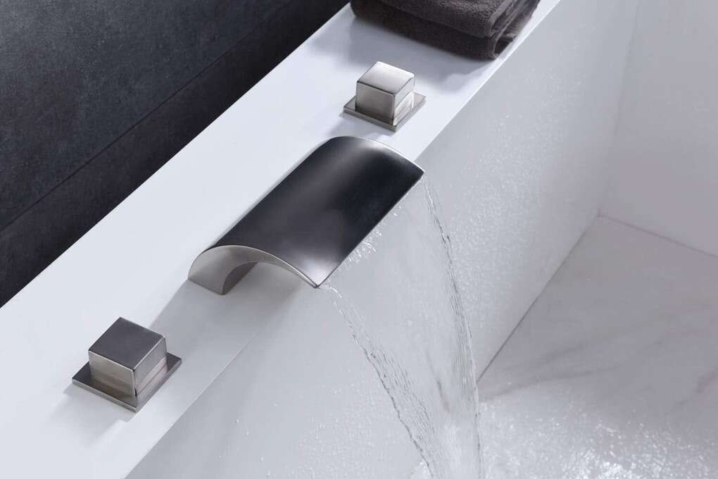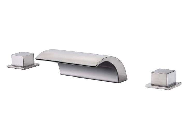 Roman tub faucets brushed nickel with wide spout features dramatic waterfall effect; Solid Brass valve body constructed with metal handles for durability. Contains drip-free MS ceramic cartridge. Tested to be drip free after 600,000 use; Recomended installation holes distance: 6 to 7. 1111-1/27/25