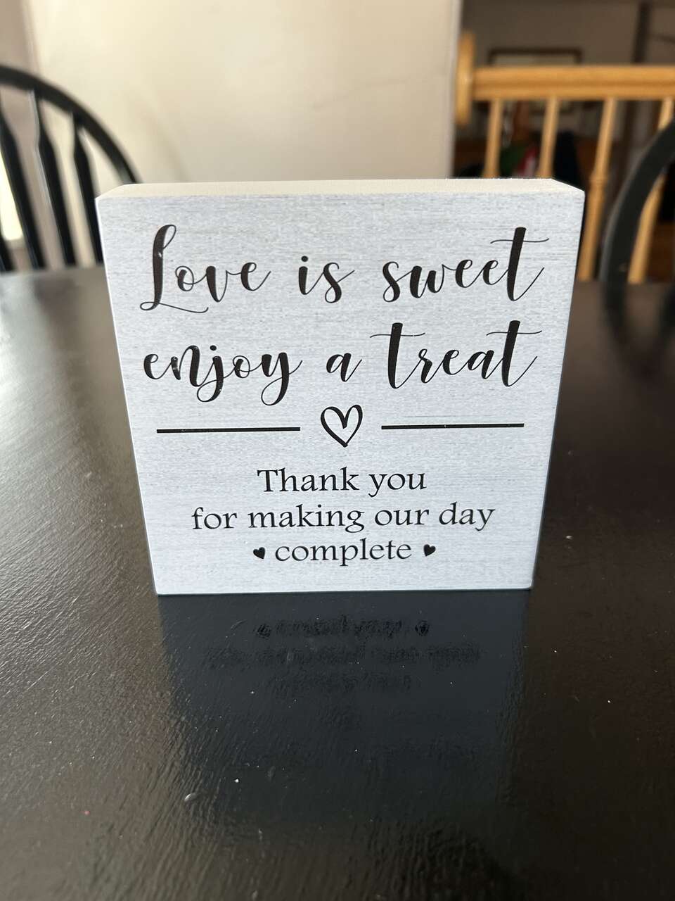 I have a Wooden Box Sign - Love is Sweet Enjoy a Treat - 5 x 5 Inches for $6 cash. This was used one time for a wedding and is like brand new. This has been in a smoke/pet free home. Contact me to see.