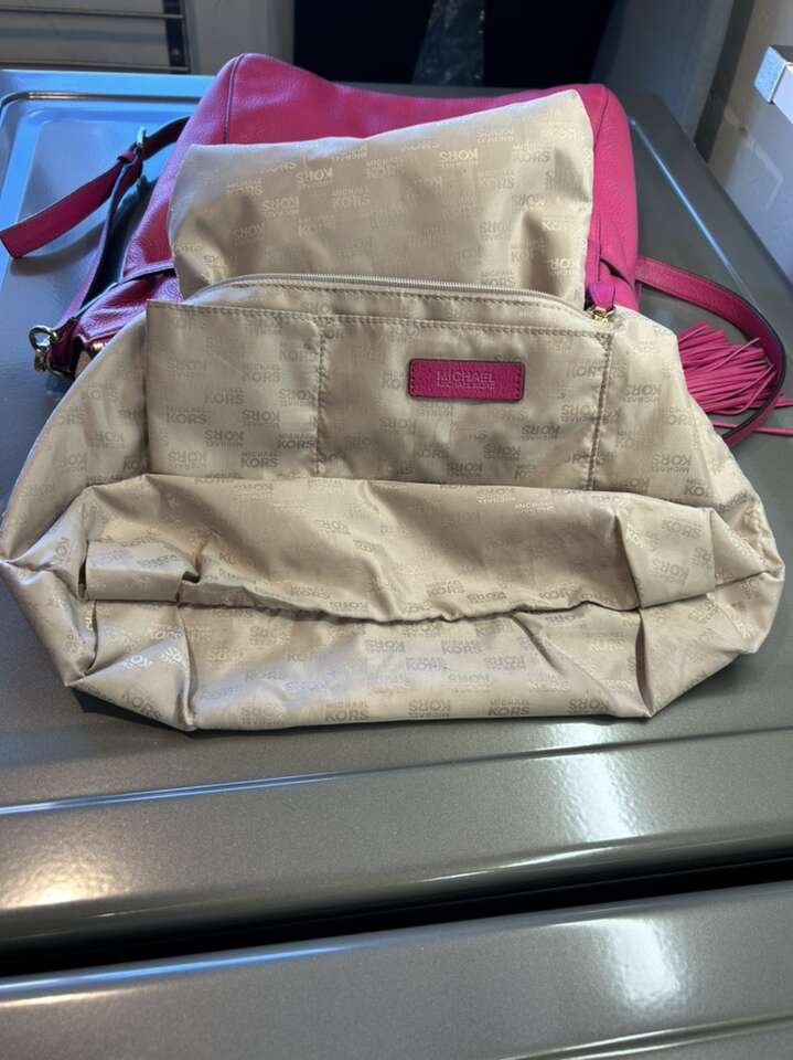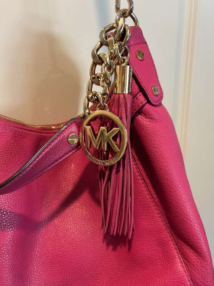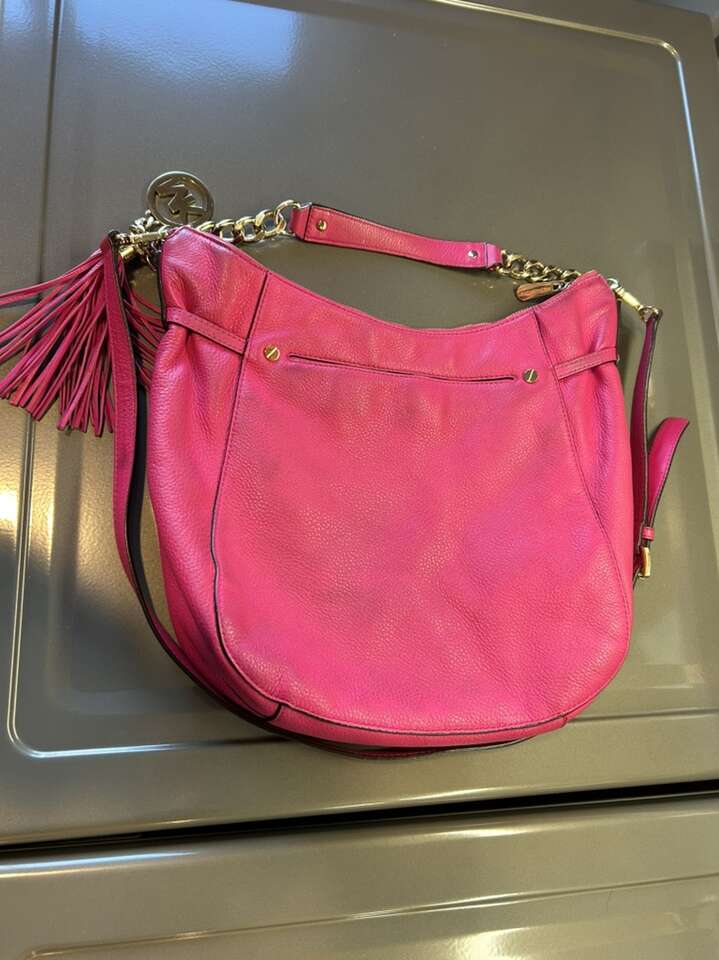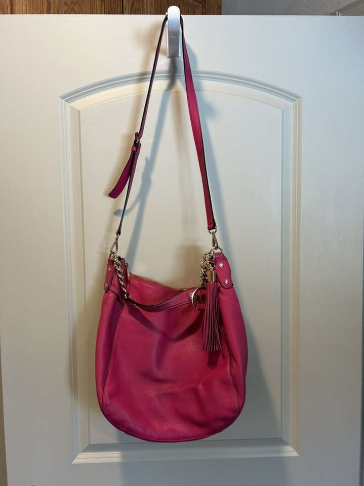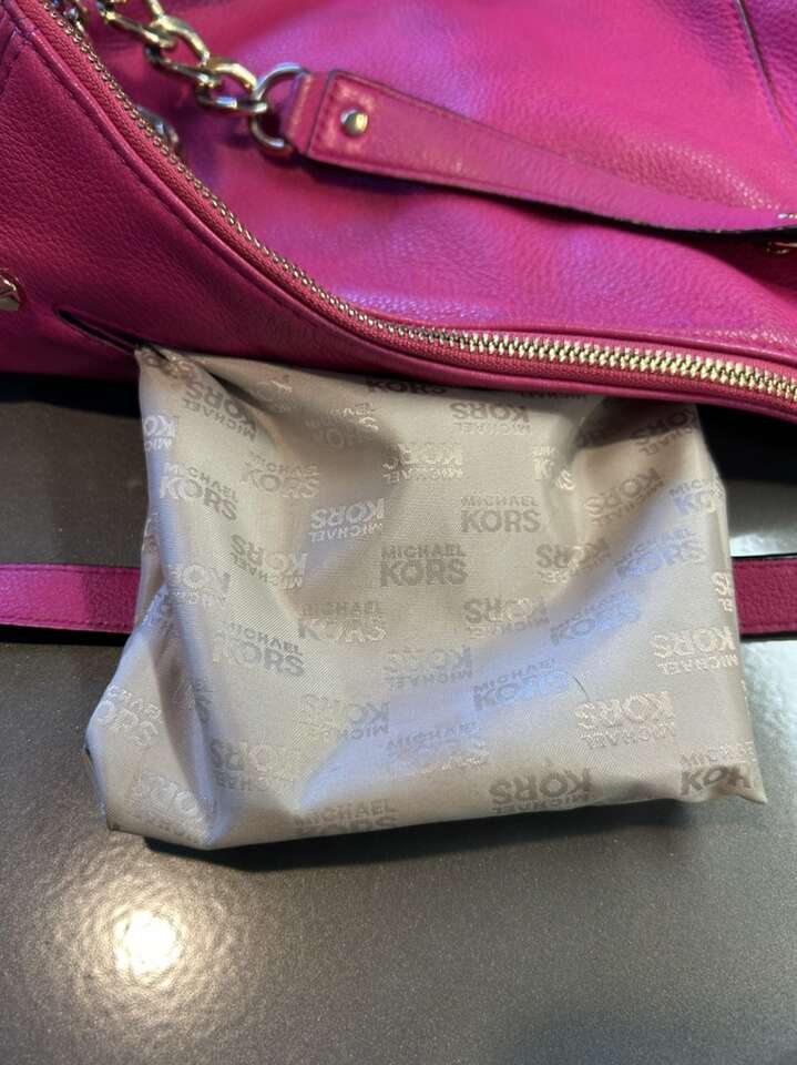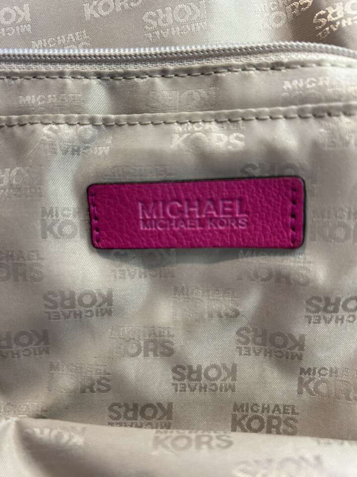 VenmoLike new Michael Kors pink Barbiecore fuchsia pink pebbled leather with shiny gold hardware. This is a beauty. Thick smooth pebbled leather in pristine condition. Liner satin signature Micheal Kors fabric is also very clean with no pen no ink no makeup stains. Gold hardware is in pristine condition. Removable leather tassel and logo. Removable shoulder or cross body strap is adjustable and removable. Clean smoke free home. Porch pickup from Alpine. Cash or Venmo.