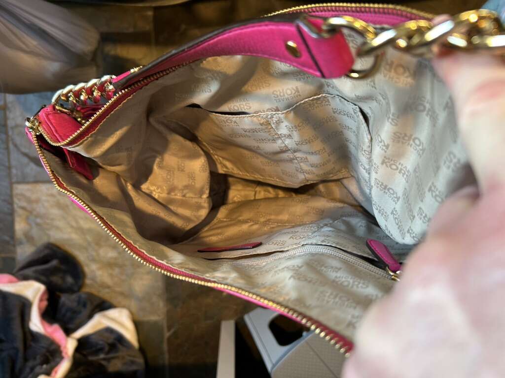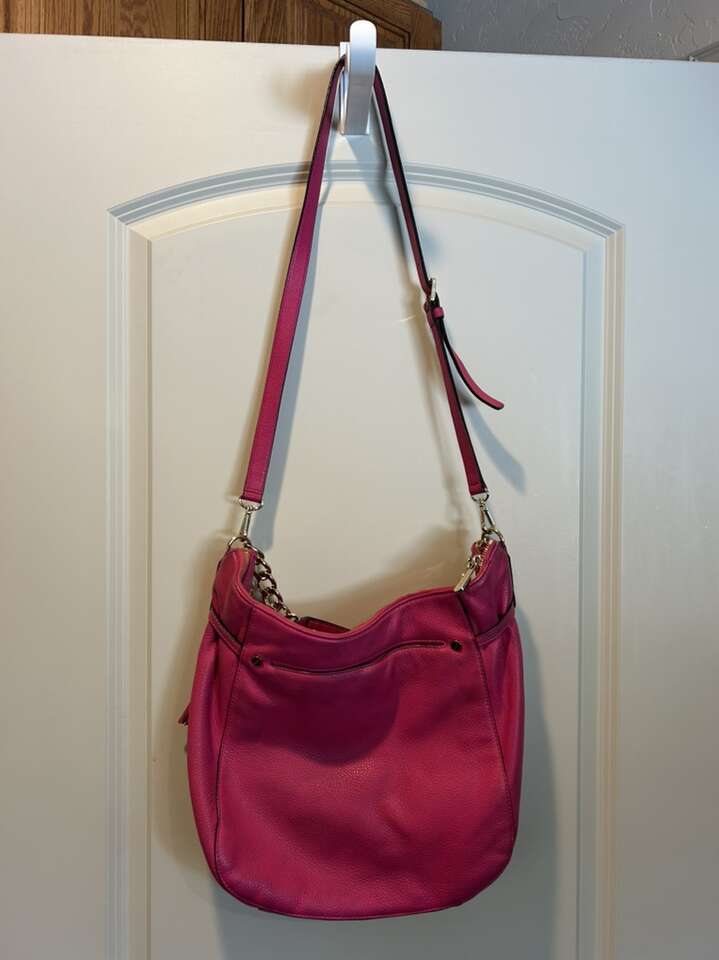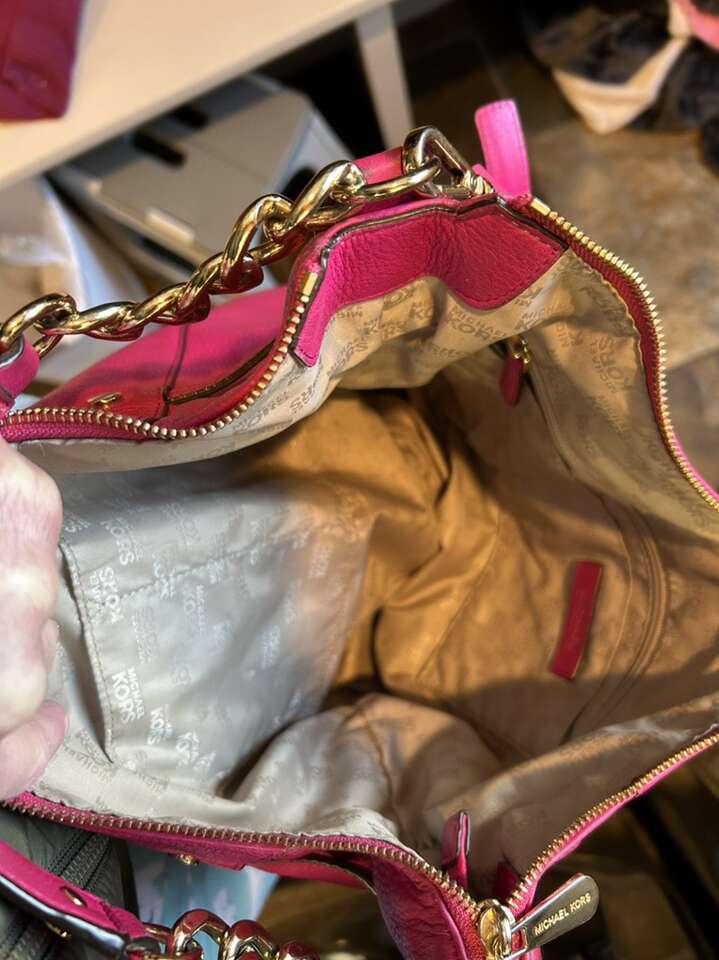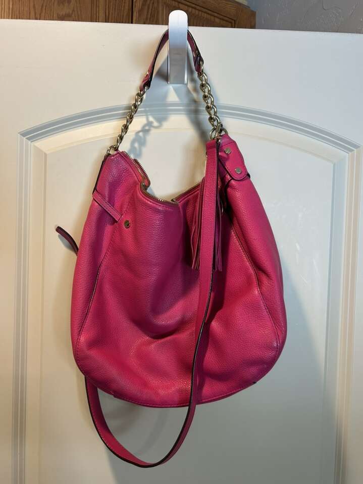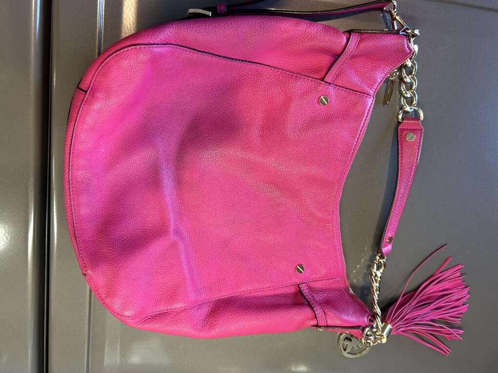 VenmoLike new Michael Kors pink Barbiecore fuchsia pink pebbled leather with shiny gold hardware. This is a beauty. Thick smooth pebbled leather in pristine condition. Liner satin signature Micheal Kors fabric is also very clean with no pen no ink no makeup stains. Gold hardware is in pristine condition. Removable leather tassel and logo. Removable shoulder or cross body strap is adjustable and removable. Clean smoke free home. Porch pickup from Alpine. Cash or Venmo.