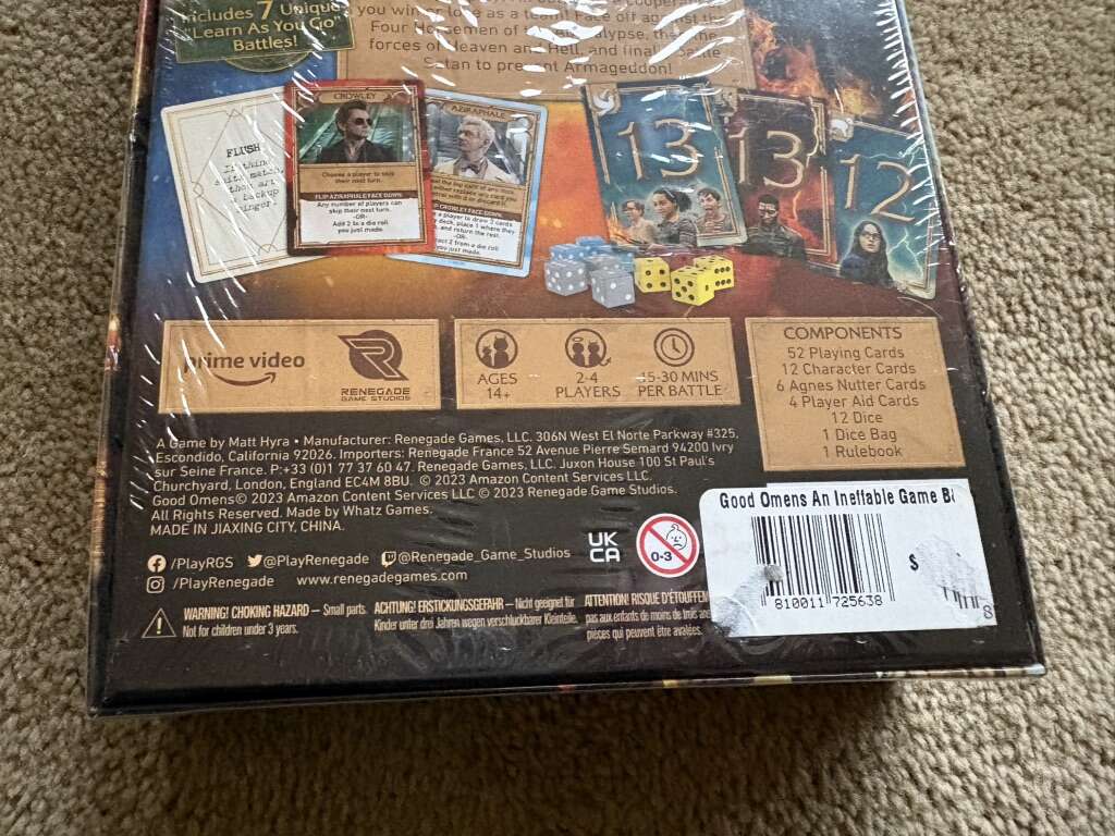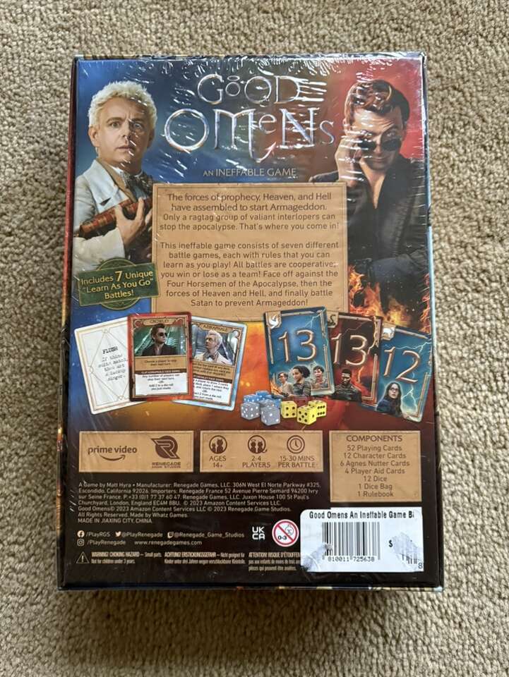NEW (sealed in plastic) Good Omens: An Ineffable Game. Based on the beloved Prime Video show with David Tennant and Michael Sheen. By Matt Hyra, Renegade, Amazon, 2023. New, unopened condition. Text only. Cash or Venmo.