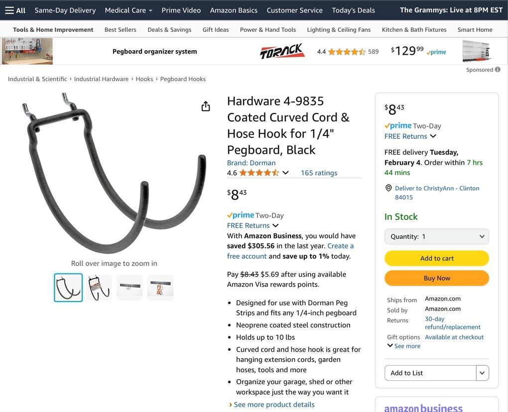 PayPalHardware 4-9835 Coated Curved Cord & Hose Hook for 1/4 Pegboard, Black