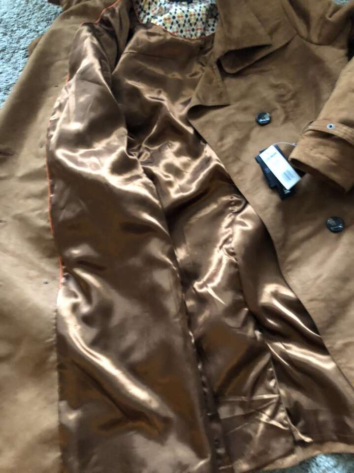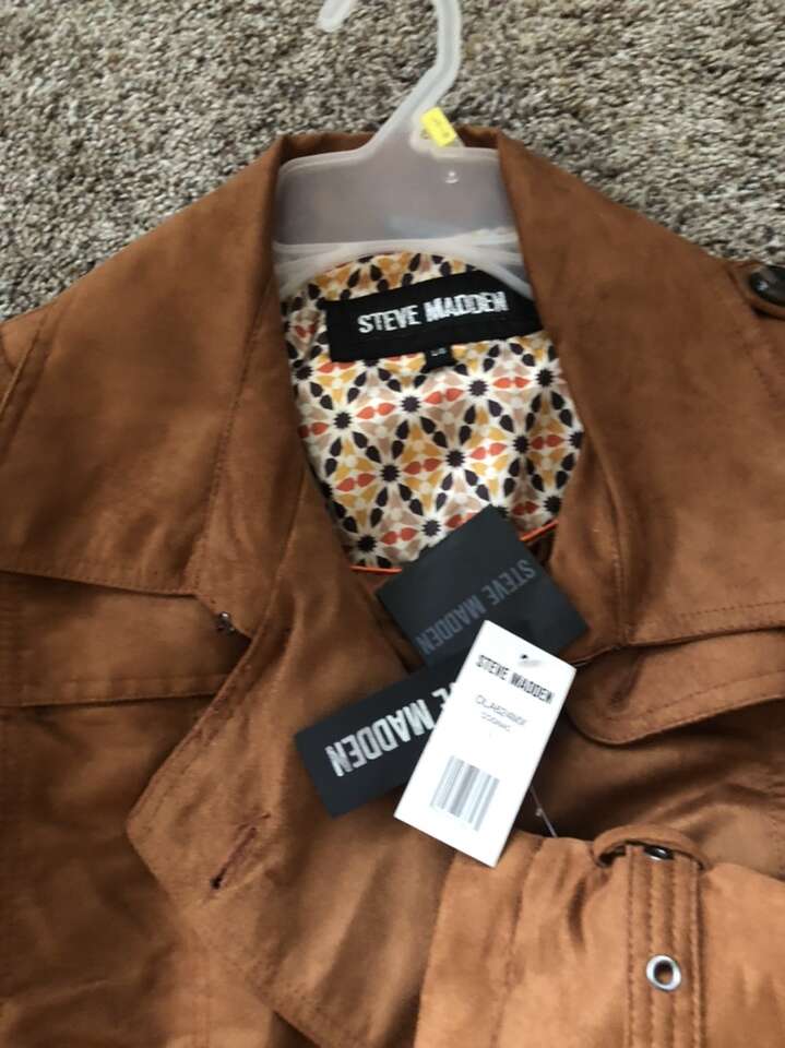 Leather like, coat brand new w/tags still attached. Steve Madden coat . Double breasted button up w/collar and belt. Has pockets and lined. Size large. Price dropped to $40 Price dropped to $35 price drop $30