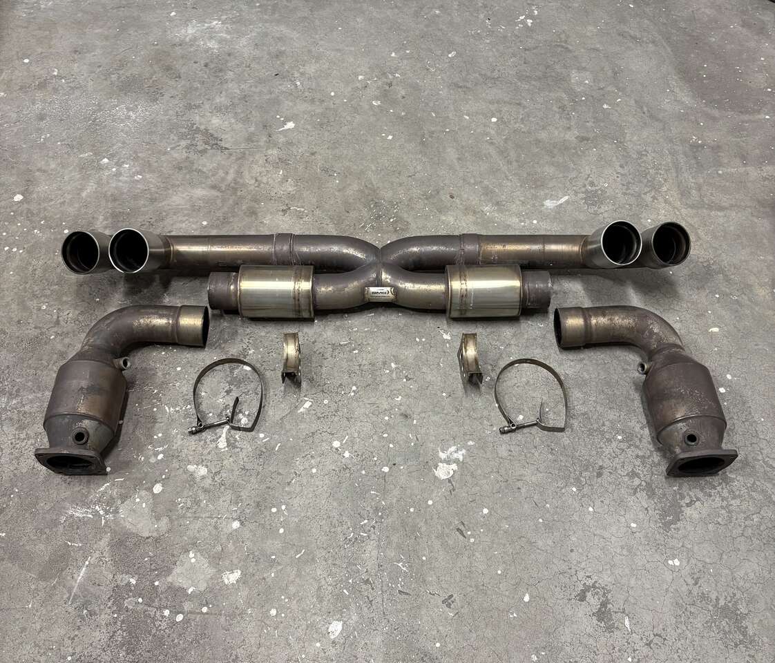 ZelleGMG Racing WC-Sport exhaust system for 2013-2016 (991.1) Turbo and Turbo S. The system features high flow German made HJS HD 200 cell sport catalysts, weighing 37 lbs total. Came on a 2014 Turbo S and swapped back to the factory exhaust, estimate 15k-20k miles on it.