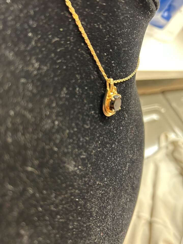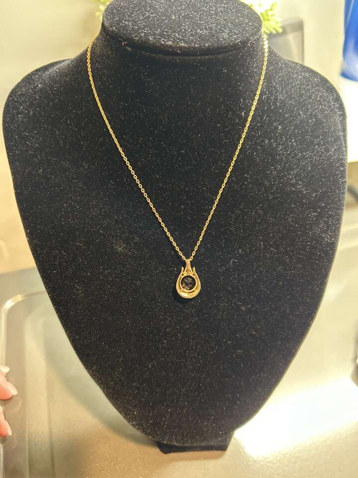 Venmo18kgf stamped on tongue portion of the clasp with round brown black stone set in a teardrop shaped pendant. Pendant is .75” tall and .5” inches wide. Chain measures 16” long. Tarnish free. Like new condition. Clean smoke free home. Cash or Venmo. Porch pickup from Alpine.