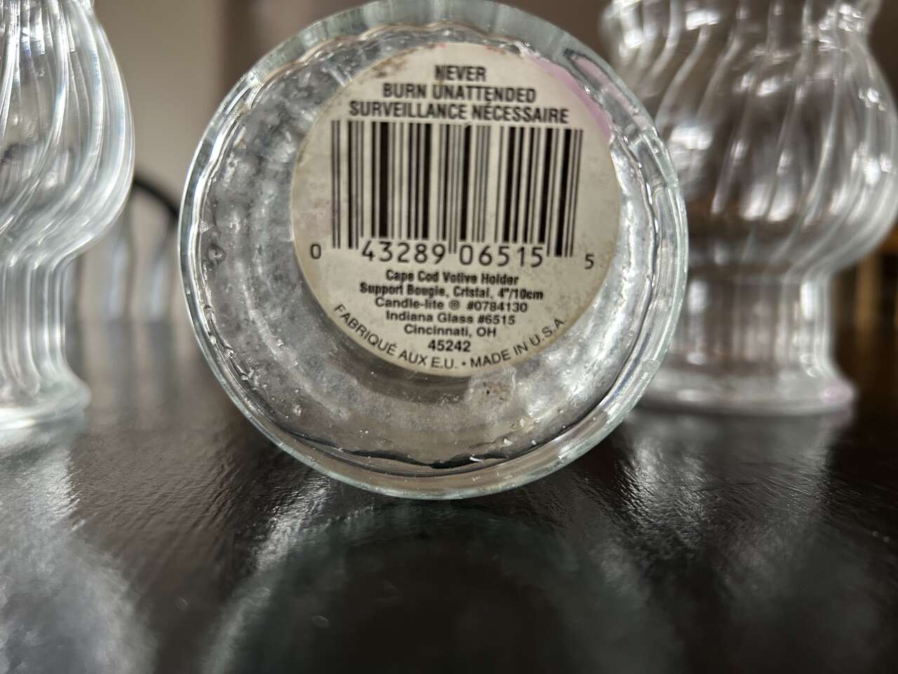 I have 3 - Glass Cape Code Votive Candle Holders - 4 Inch all for $6 cash. These were used for one dinner and still like new. There is a small amount of candle wax in the bottom edges on 2 of them but not real noticable and can probably be cleaned out if you know how. Contact me to see.