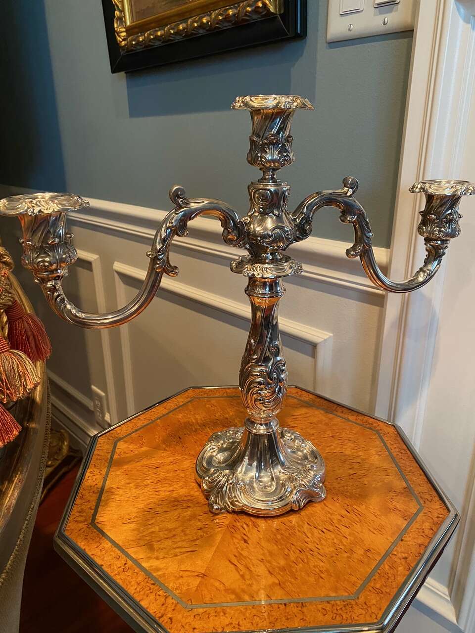 Large 15 1/2" Silver Plate Candelabra Candlesticks Reed & Barton 741 Vintage Large and impressive three light candelabra in an ornate Victorian style. They are heavy and quality made by the Reed and Barton Co. of USA, marked on the underside "Reed & Barton" and with the number "741". Vintage C.1950. Very elegant and would really dress up a dining table, mantle, dressing table, sideboard