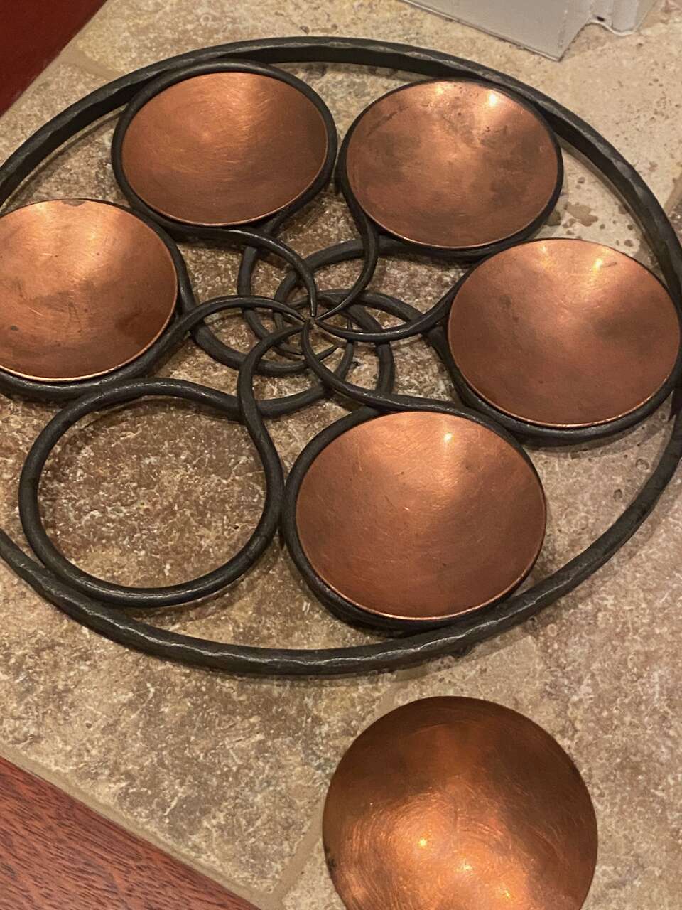 Wrought iron, hand forged art piece purchased in New York over 20 years ago. 13" diameter wrought iron design, complimented by 6, 3 3/4" diameter cooper dish inserts. One of a kind and very well made by blacksmith artist. beautiful art piece.