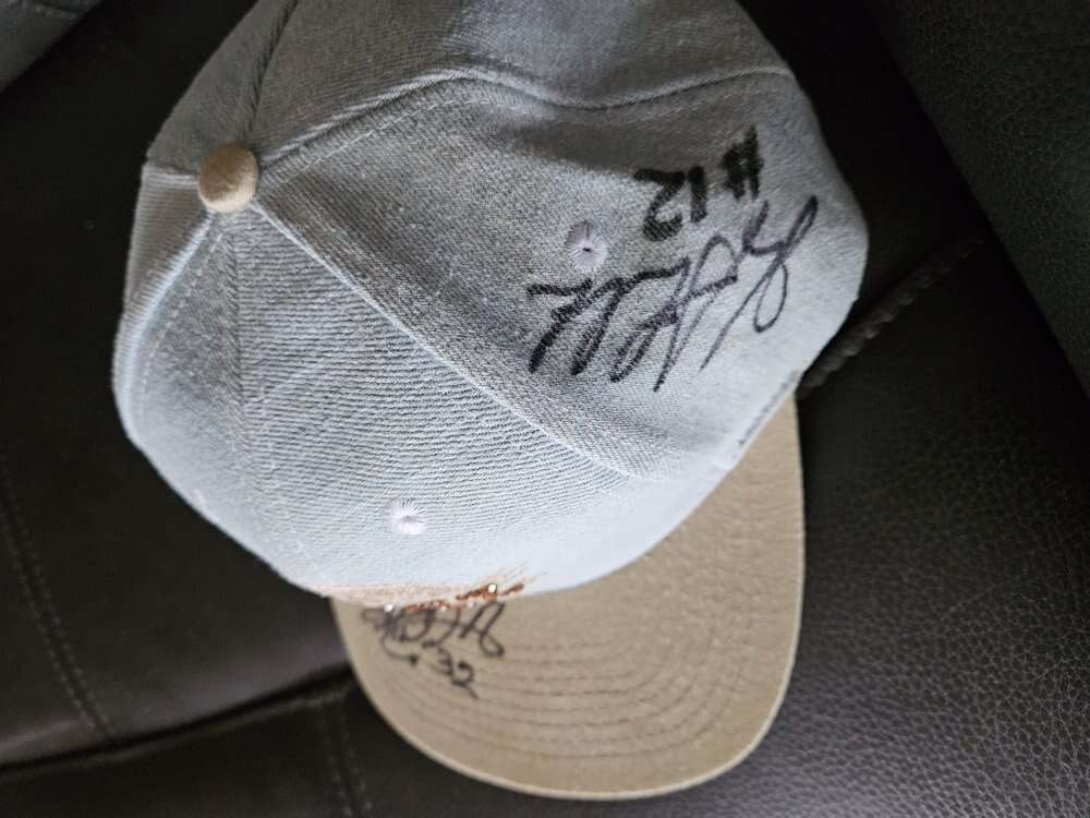 New, never worn hat with signatures. Approximently 24 years old. Kept in plastic bin and then in cardboard box. My uncle, whose son knew Karl, got the hat signed and gave it to my daughter. Not sure what the value is, but getting Karl and John at the same time was pretty rare. I have not had it appraised or authentication done because I know it was signed by them. If very interested, I can look into getting it done.