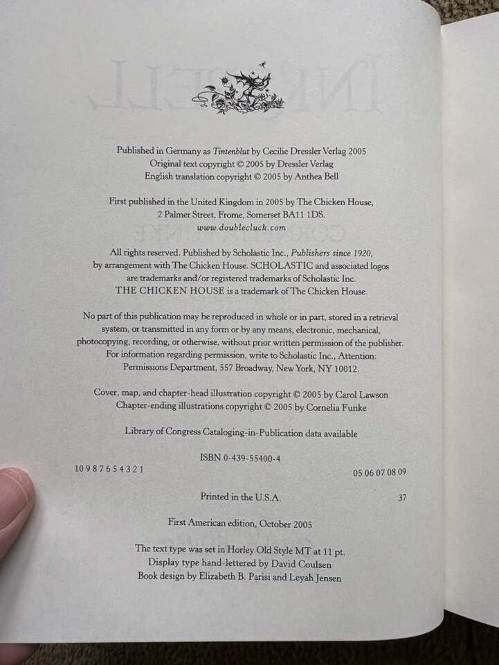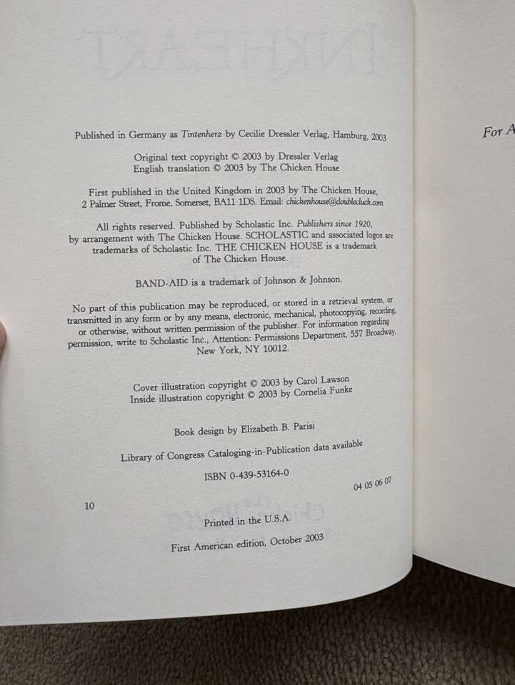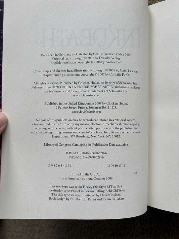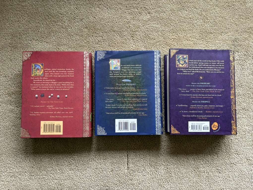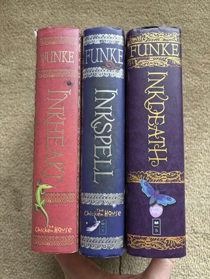 COMPLETE Inkheart Trilogy, by Cornelia Funke: Inkheart (2003, 534 pages), Inkspell (2005, 635 pages), and Inkdeath (2007, 682 pages). Translated from the original German. First American editions in excellent condition, including dust jackets. Text only. Cash or Venmo. Discount on multiple items.