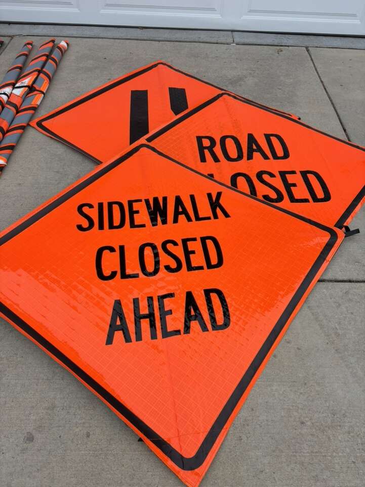 Description- (LOT OF 30) Various NCHRP-350 compliant 48“X48“ durable vinyl roll-up road construction safety signs in high visibility reflective orange. Includes MULTIPLE of each of the following… “Sidewalk Closed”, “Left Lane Closed Ahead”, “Right Lane Closed Ahead”, “Shoulder Closed”, “Utility Construction Ahead”, “Utility Work Ahead”, “Road Closed Ahead”, and lane ends/merge symbols. Signs only (stands not included) but these signs will work with typical stands. See photos for more product information and specifications.
