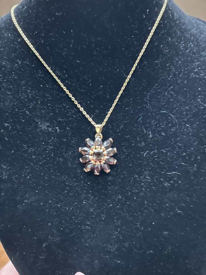 VenmoLike new 18kgf stamped on the tongue of the clasp gold tone chain with citrine brown stone flower pendant. Flower pendant is just slightly smaller than a circumference of a quarter. Beautiful. No flaws or defects. Spring ring closure. Smoke free home. Cash or Venmo. Porch pickup from alpine.