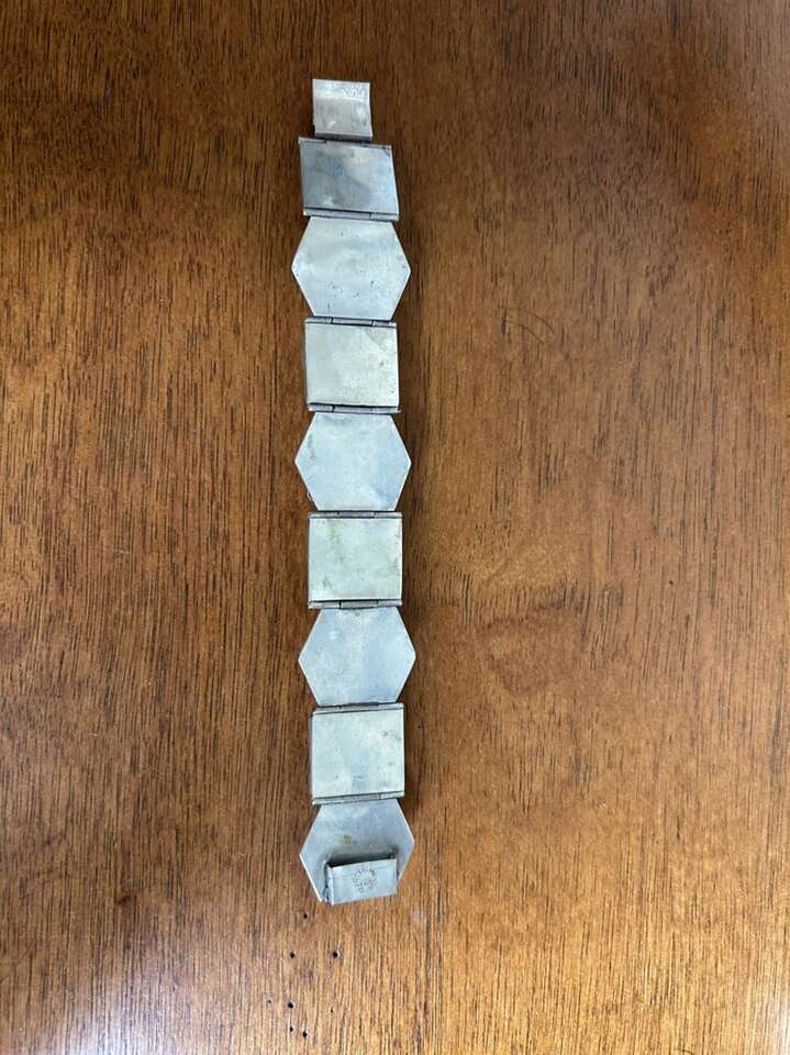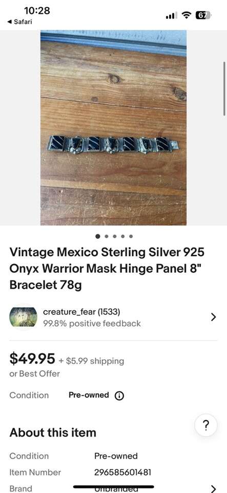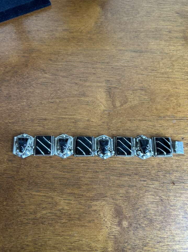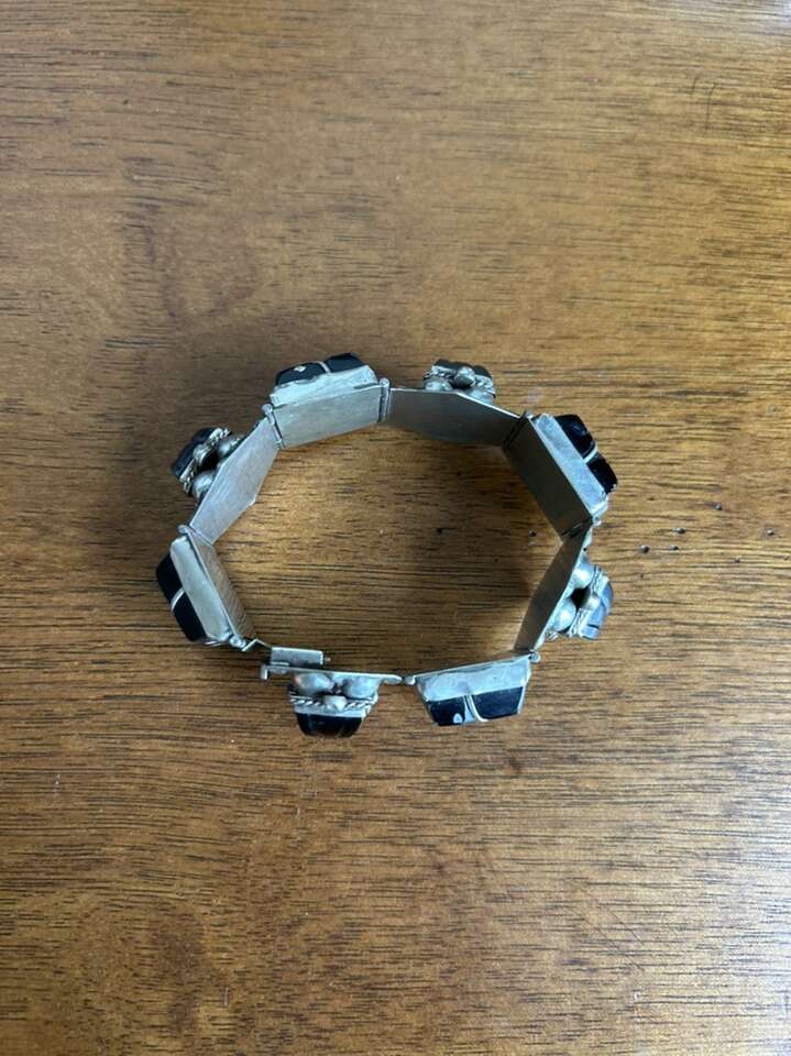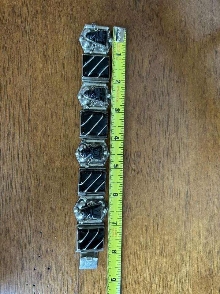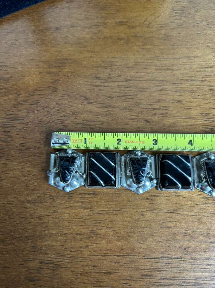 VenmoSterling silver stamped Mexico, 8 inch vintage black Onyx warrior mask hinge panel bracelet. This measures 8 inches long 1 inch wide and weighs 78 g. In good condition with minor wear. One of the Warriors is missing and earring and tiny chips in the Onyx. Clean smoke free home. Vintage from the 1960s or 50s. Porch pick up from Alpine. Cash or Venmo.