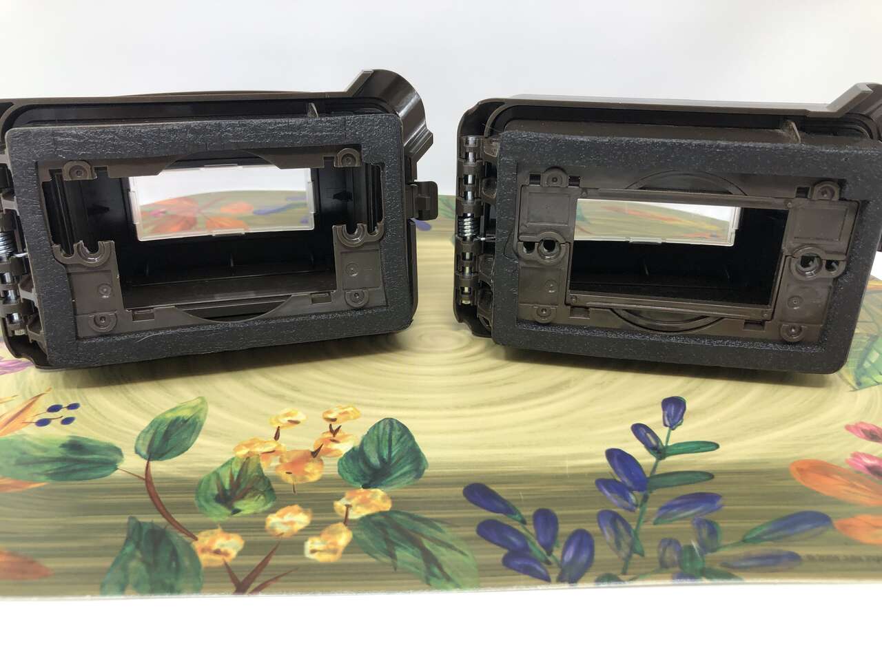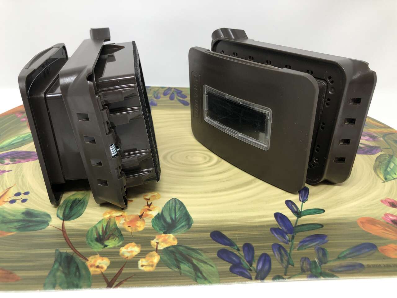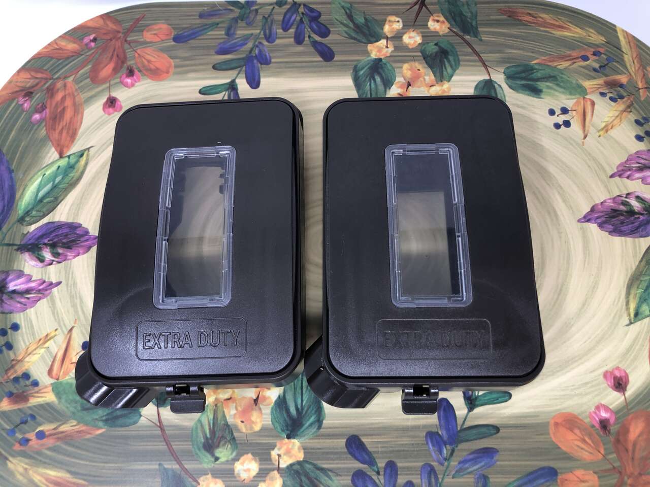 We have 2 high-quality Extra Duty expandable weatherproof outlet covers. They have a rubber corner where the plug, extension cord, power cord will go through so you can use the outlet in any weather. The bases have a thin foam edging to create a solid seal around your outlet. Both expand upward an additional inch by lifting the cover. Both have a clasp closure with spring-loaded covers. One of the covers comes with an adjusted insert that can be popped out (the one that only looks rectangular on the back).