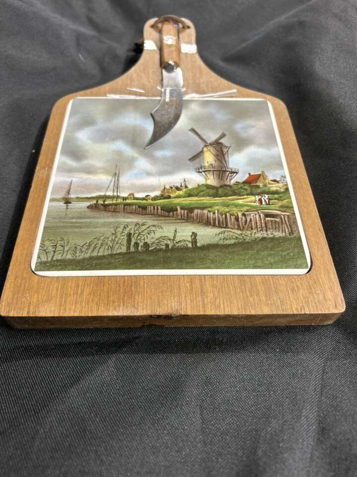 Vintage Wooden Cheese Cutting Board with Ceramic Tile & Knife – Windmill Scene