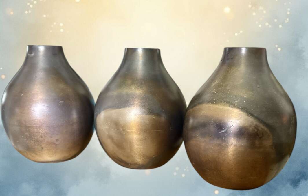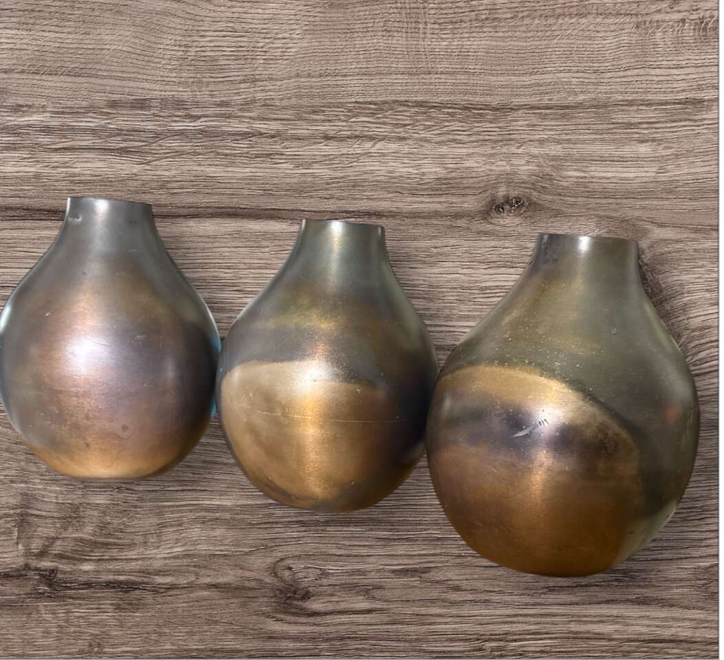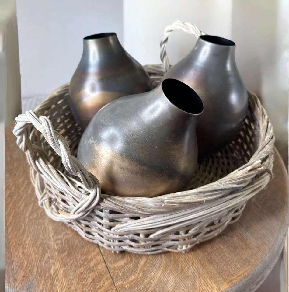 Venmo3 Crate & Barrel Bringham Iron Round Vases Gray Bronze Rustic Artifact-Style 8.5” tall 6” wide opening 2 1/8”