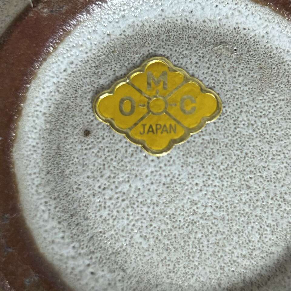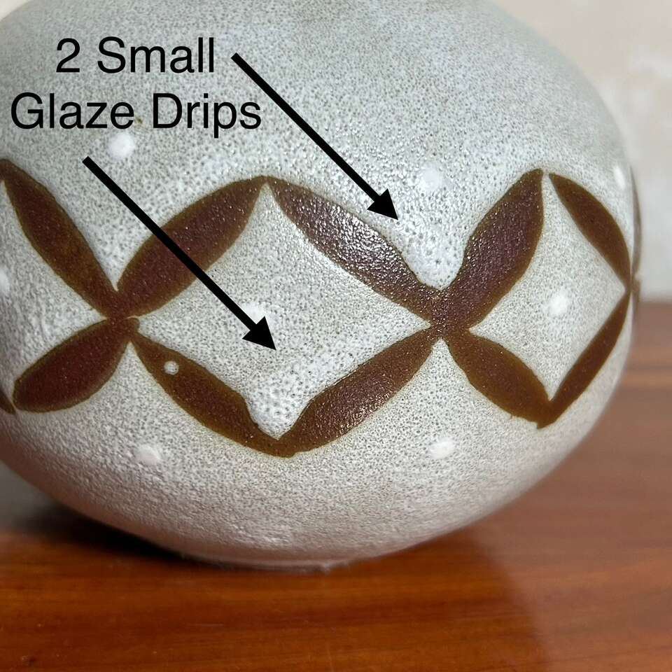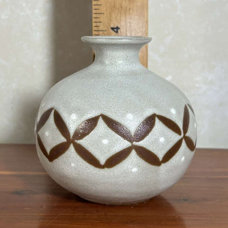 Vintage Mid-Century Modern Japanese art pottery bud vase was made by Otagiri Mercantile Co. in Japan. The vase features a Modern geometric pattern in beige glaze over brown clay. With a distinct mid-century style, this vintage Otagiri vase is a unique piece of decorative pottery. No chips, cracks, crazing or defects other than the two glaze drips as seen on the photo on one side of the vase. Size is 4” tall X 4” wide. Has original foil “OMC Japan” label on the bottom.