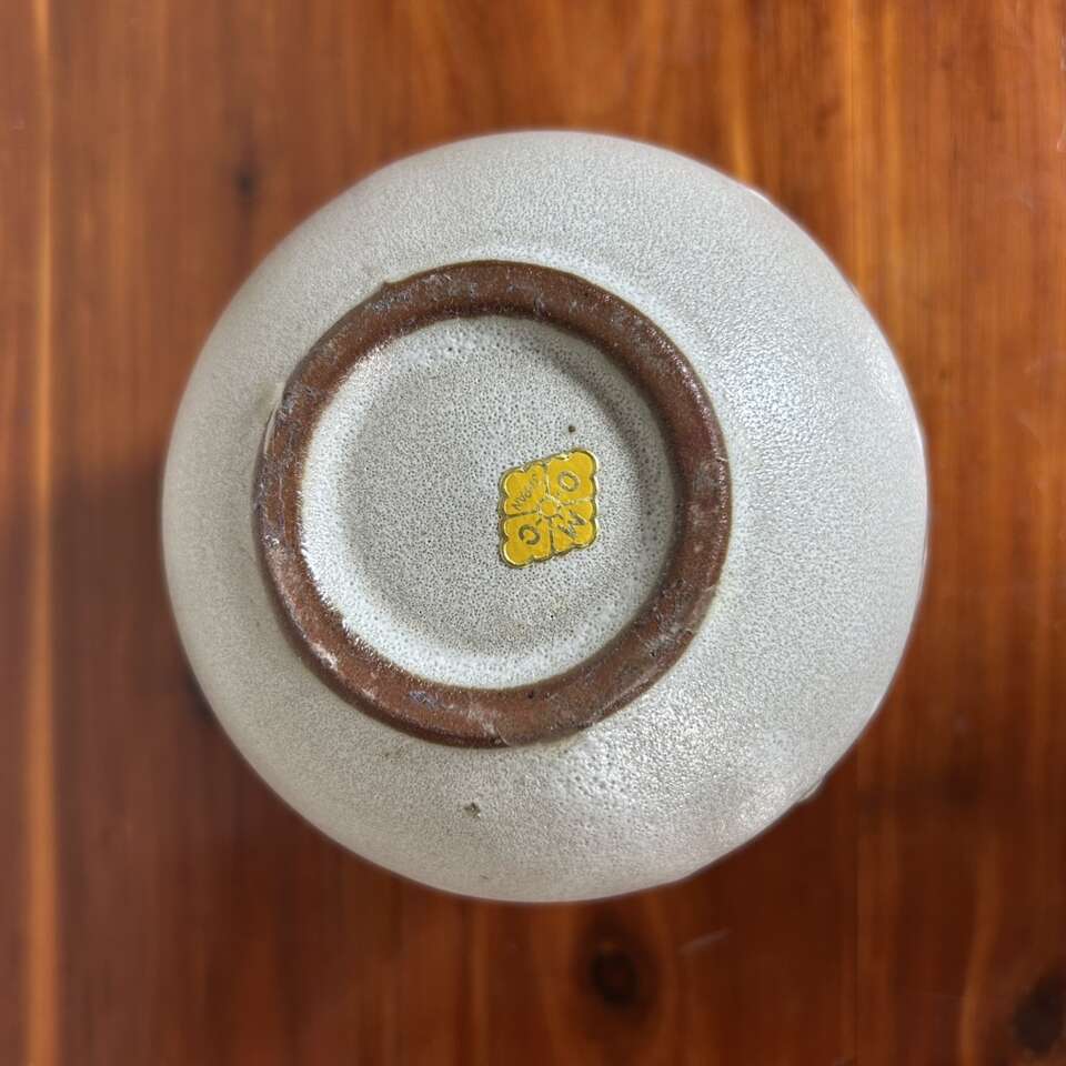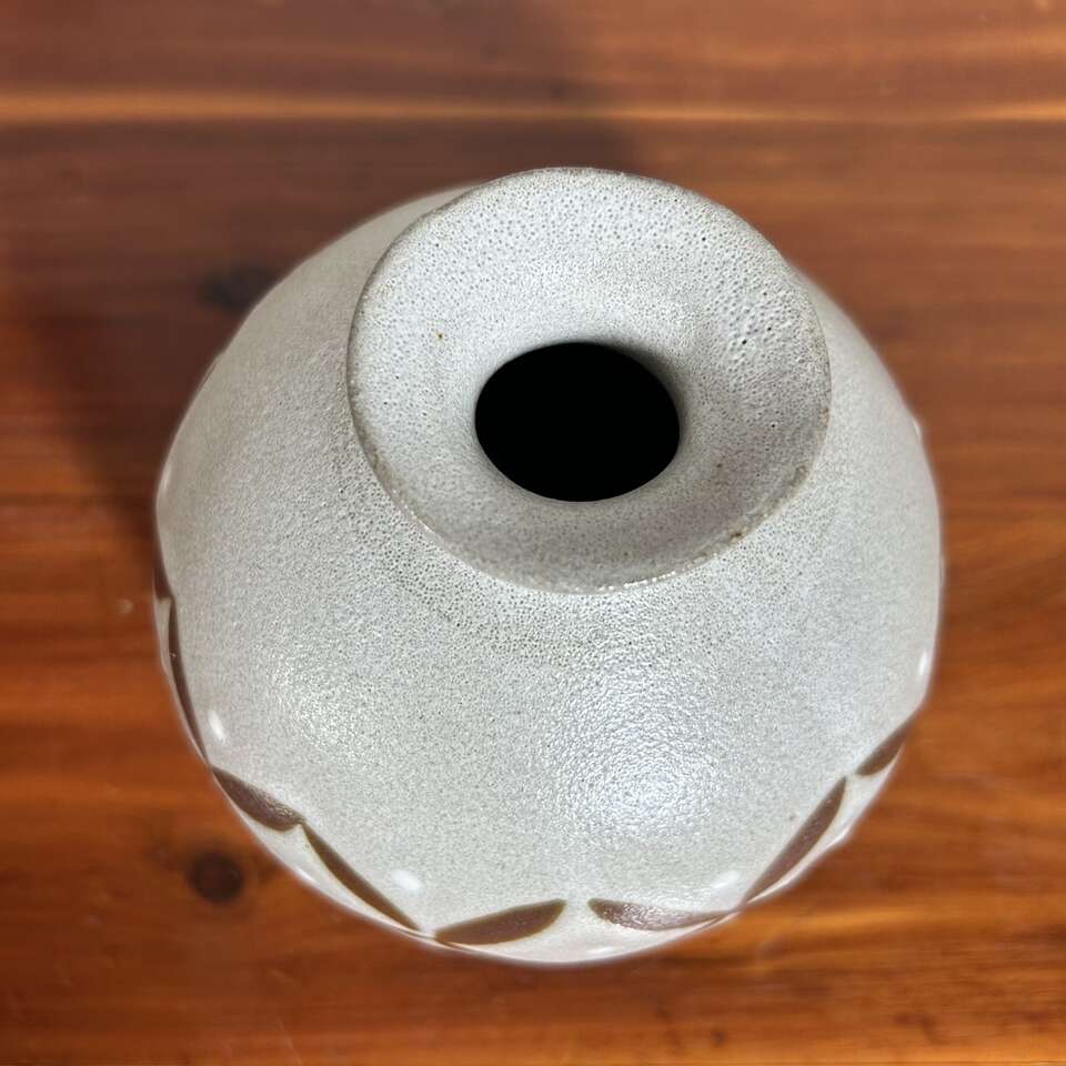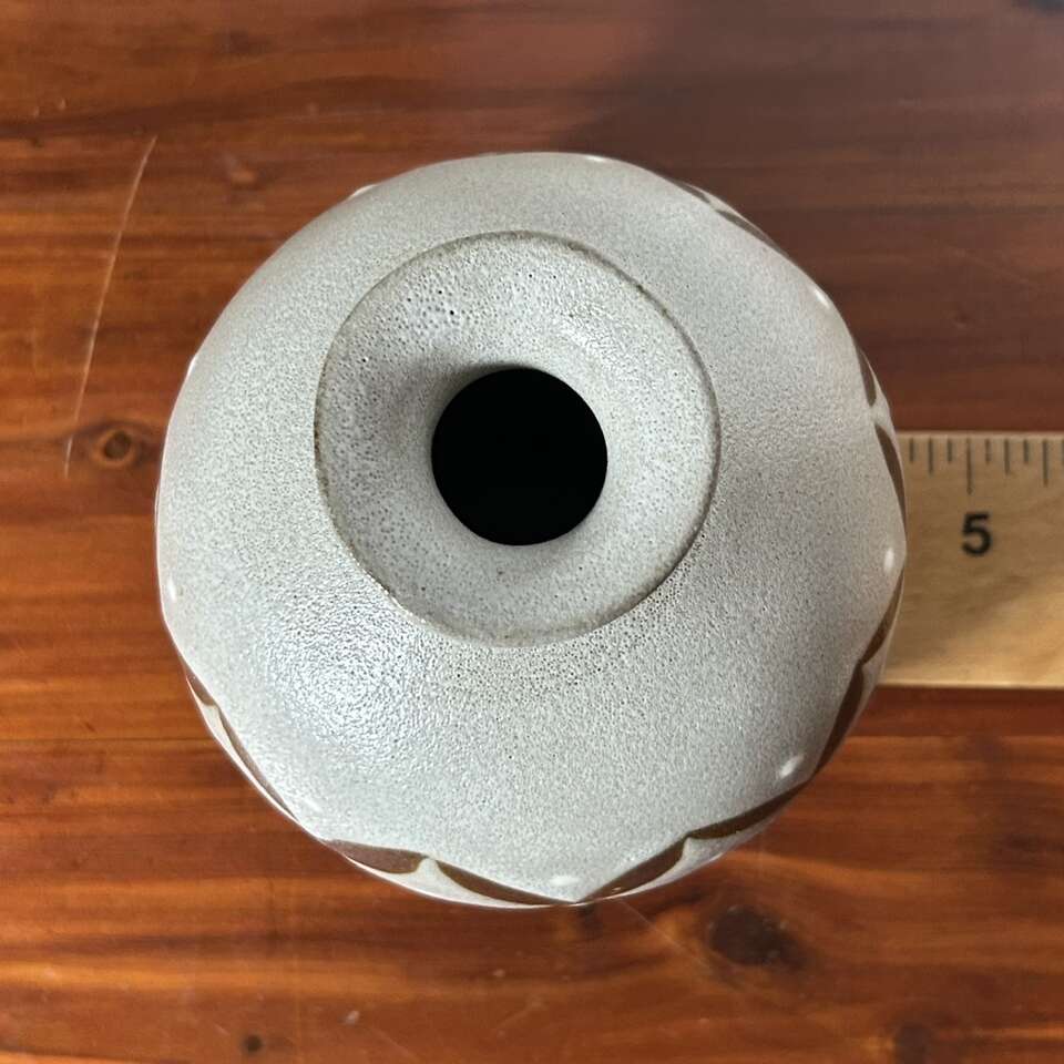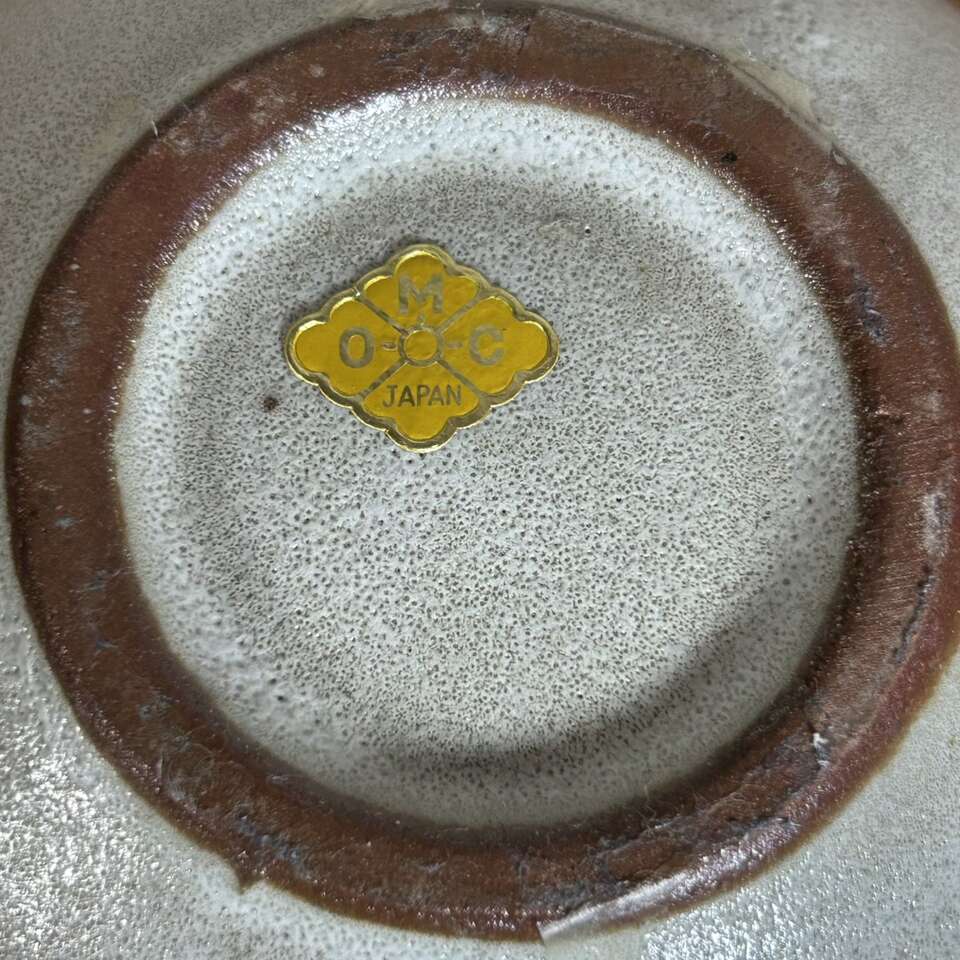 Vintage Mid-Century Modern Japanese art pottery bud vase was made by Otagiri Mercantile Co. in Japan. The vase features a Modern geometric pattern in beige glaze over brown clay. With a distinct mid-century style, this vintage Otagiri vase is a unique piece of decorative pottery. No chips, cracks, crazing or defects other than the two glaze drips as seen on the photo on one side of the vase. Size is 4” tall X 4” wide. Has original foil “OMC Japan” label on the bottom.