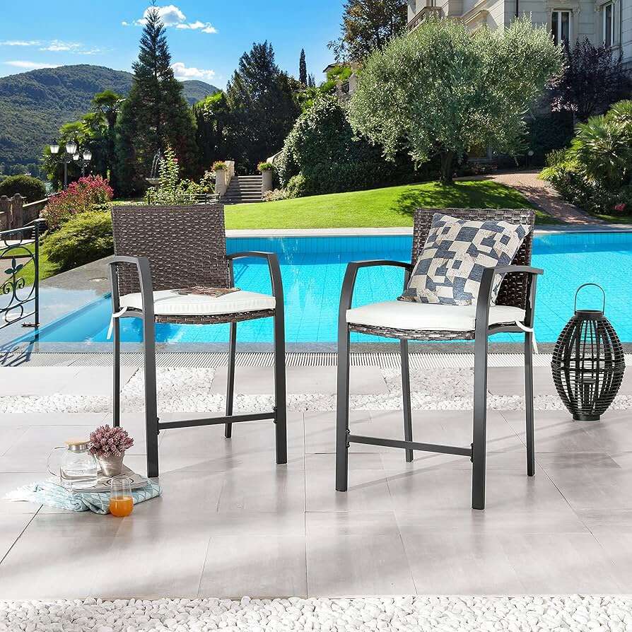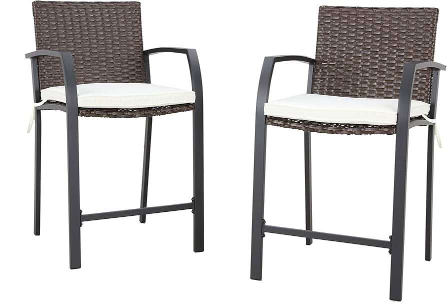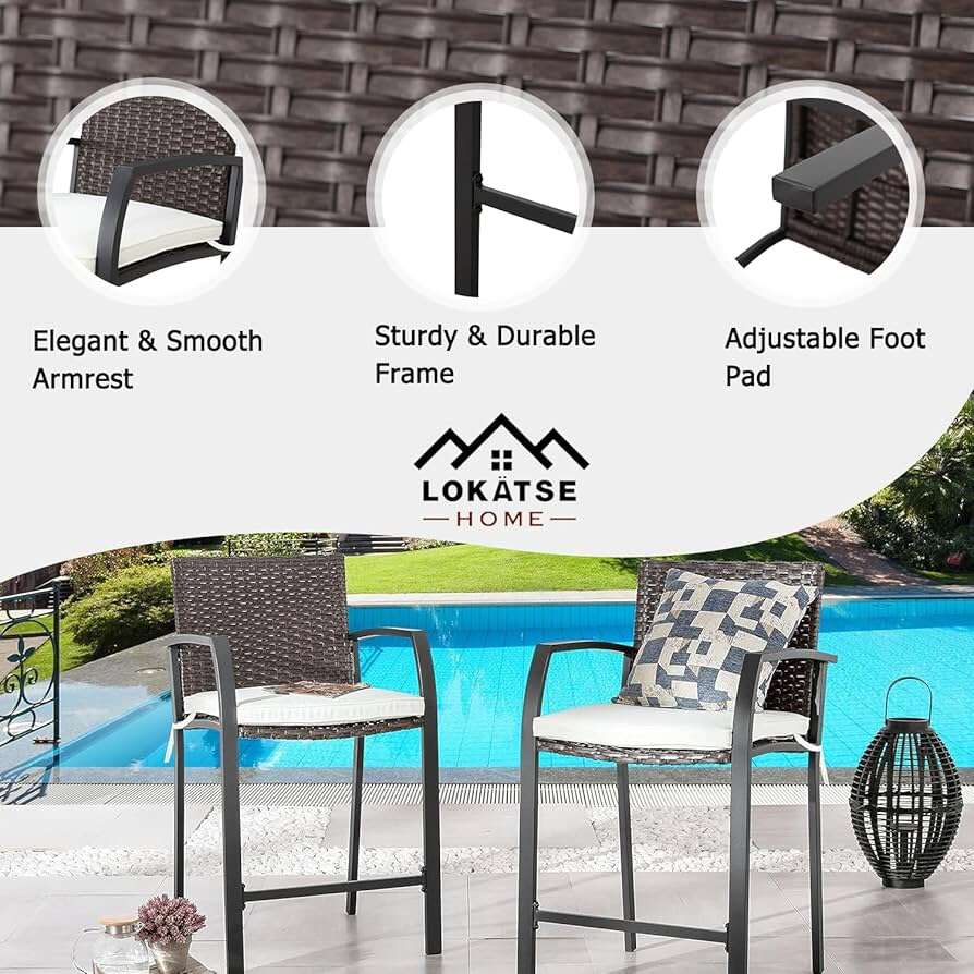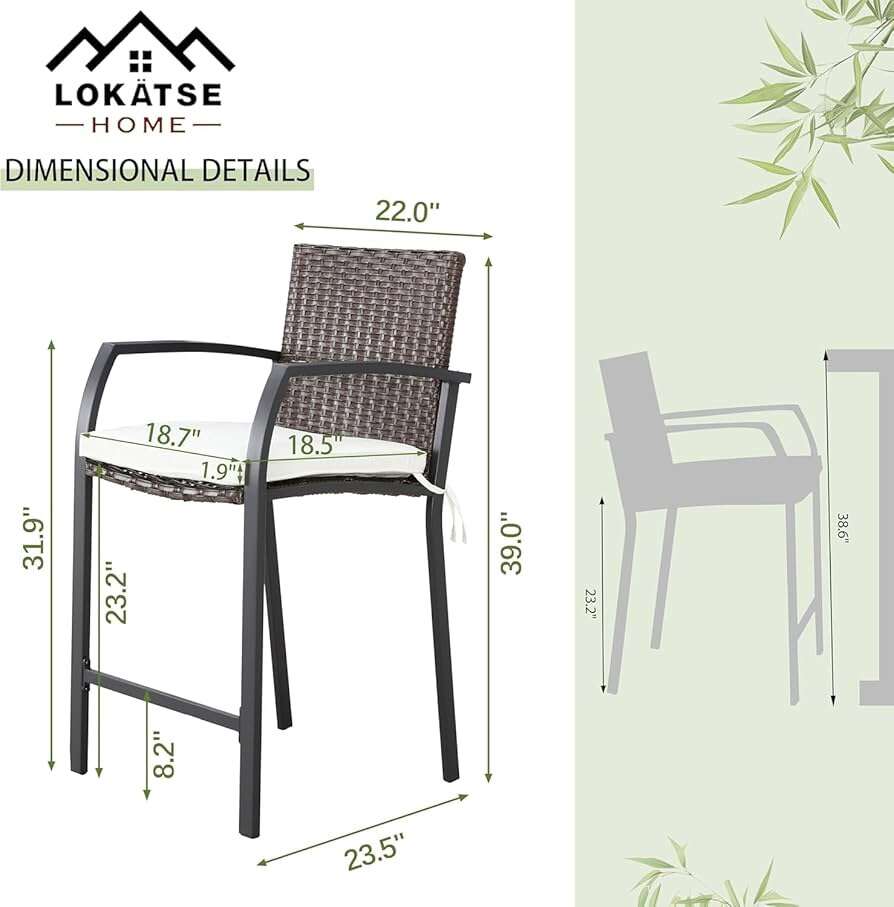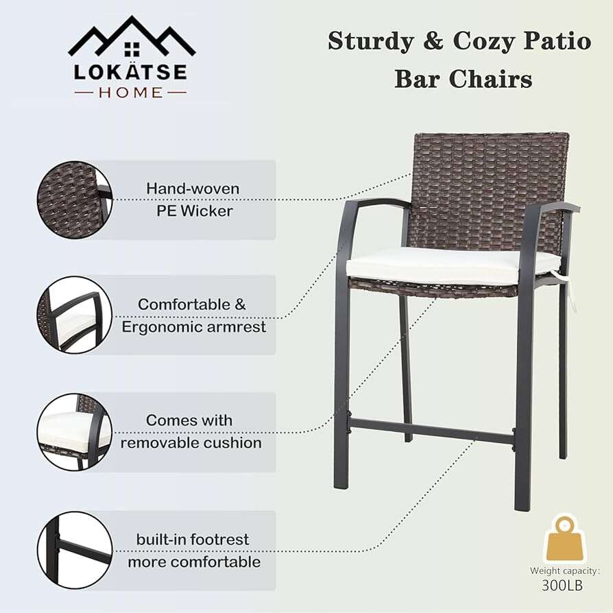 New in Box!!! •Wicker bar stool height come with tied cushions which add more comfy for having a rest. The high back provides support for your spine, built in footrest and armrest makes you more relax in summer night. •Highly durable wicker covers an iron frame while resisting fading and wear from the sun and rain. These bar stools will be perfect for indoor, outdoor, garden, park, patio, porch, poolside, yard, deck, etc.