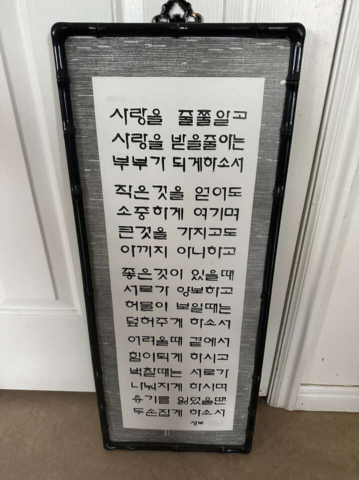 The image displays a framed piece of Korean calligraphy, known as Seoye (1 0l), an artistic form of writing in Korea. The text, written in Hangul, conveys a message about the ideal qualities and actions within a relationship, possibly a marriage, emphasizing mutual respect, support, and understanding.