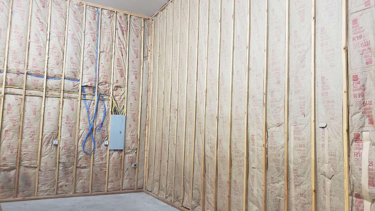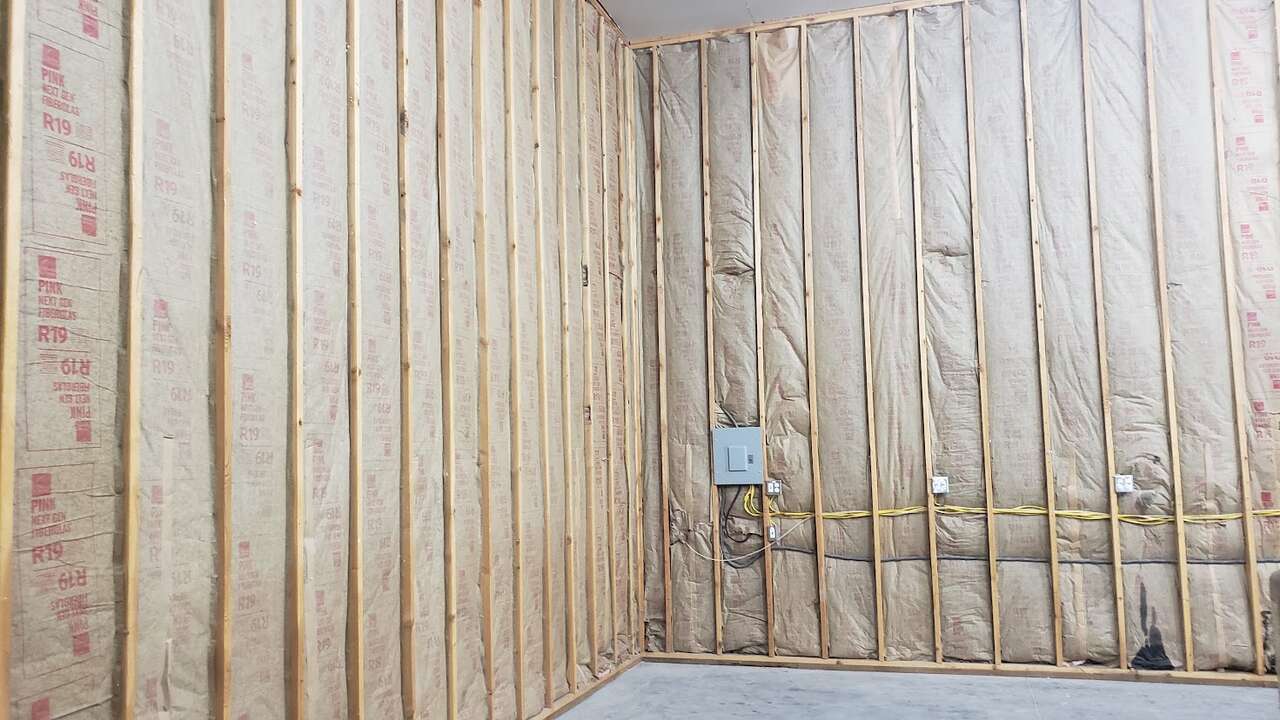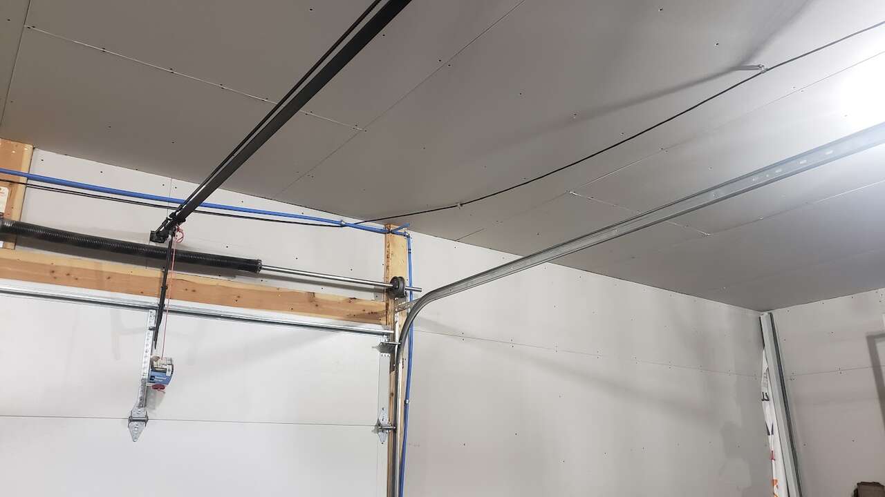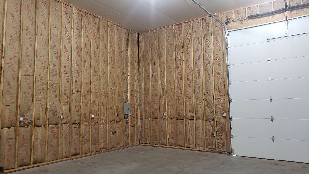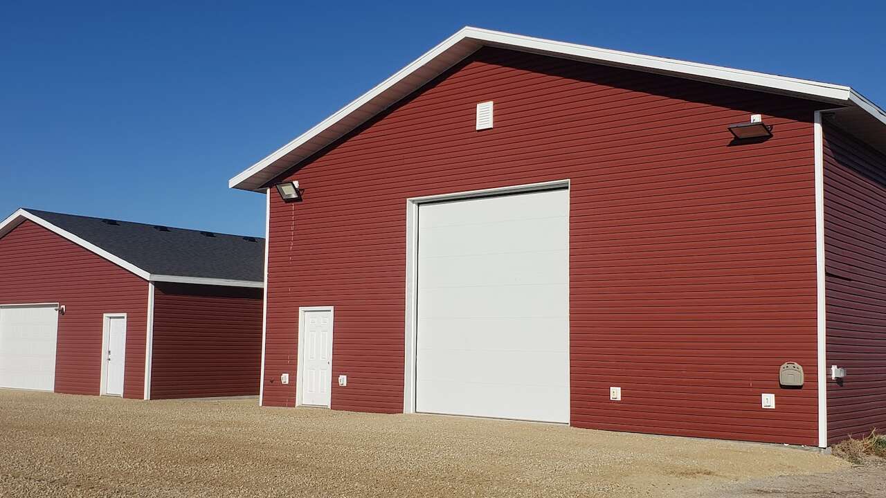 East shop is 16 ft tall, door is 12' wide x 14' tall with a 6” reinforced cement floor, Insulated, ceiling drywalled, with heater.
