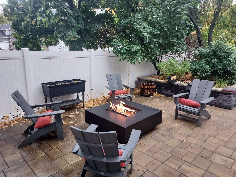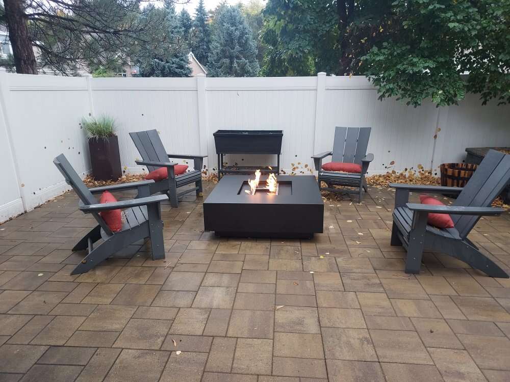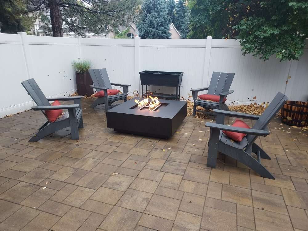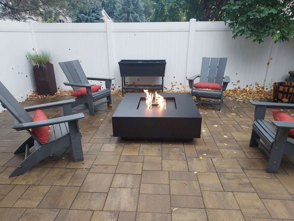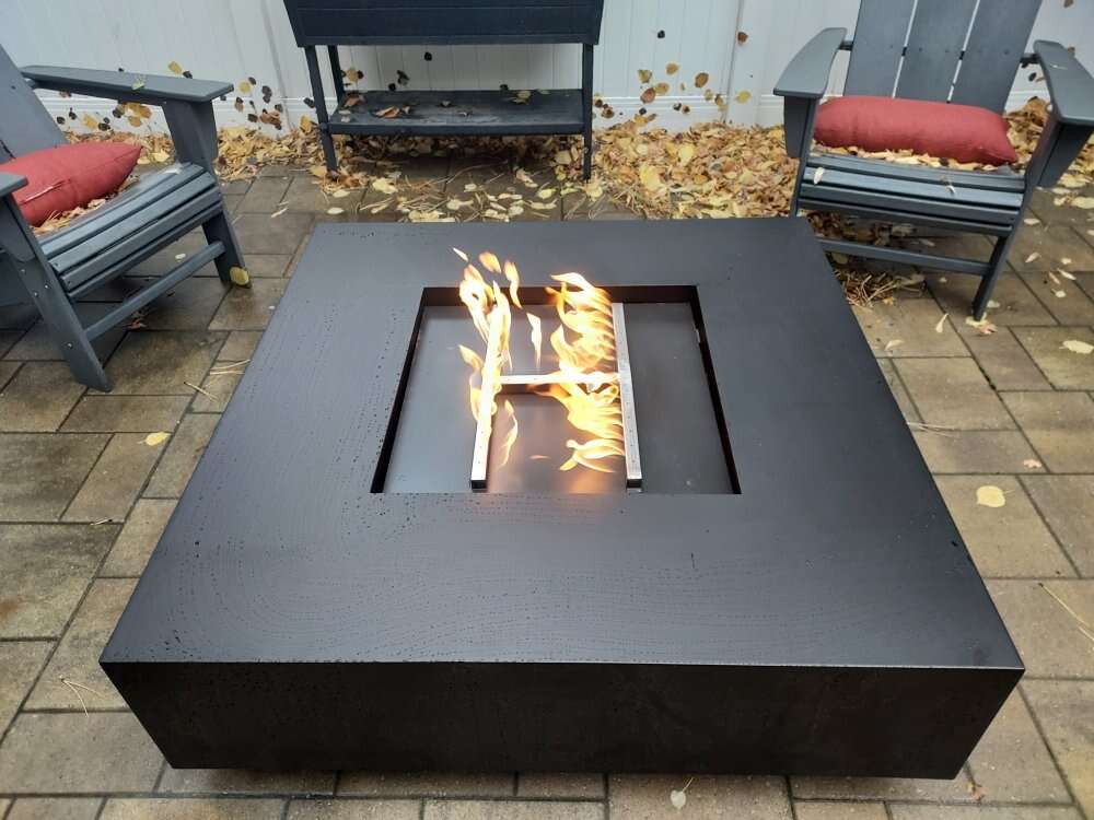 Fire table measures 48 inches by 48 inches by 12 inches tall. Is set up for natural gas or propane.Comes with stainless steel hoses.Key valve and the stainless steel H burner is rated at a 150000 BTU's comes with leveling feet. And your choice of color.