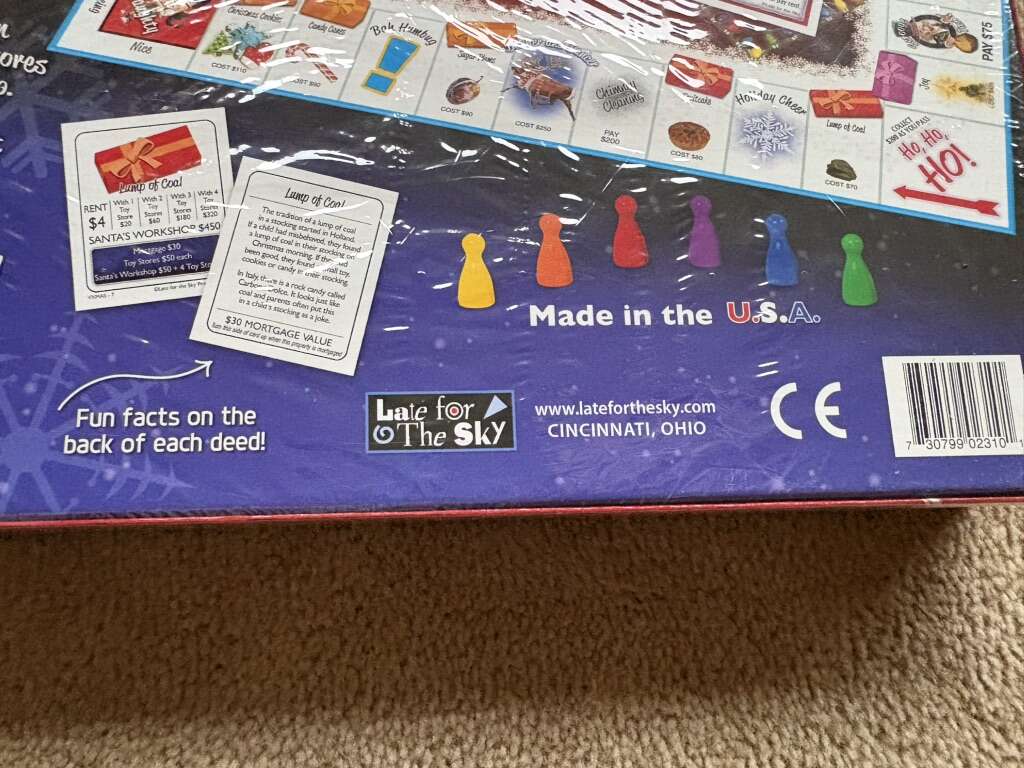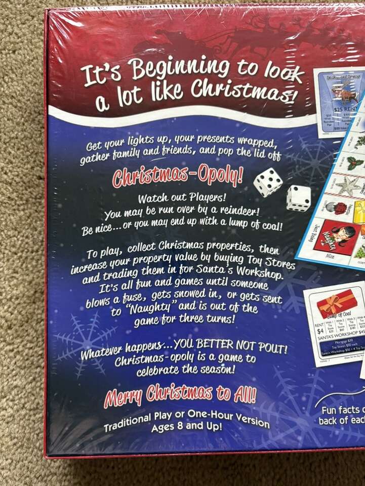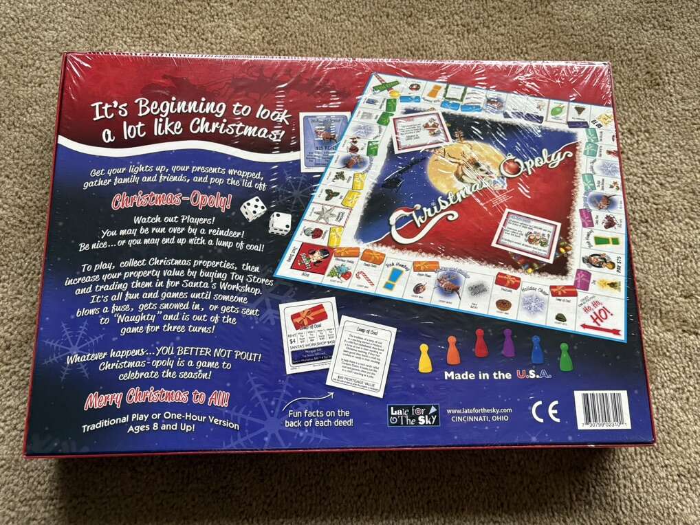 NEW (sealed in plastic) Christmas-opoly Board Game: A game to celebrate the season! A Monopoly-style game by Late for the Sky. 2-6 players, ages 8+. New, unopened condition. Text only. Cash or Venmo.