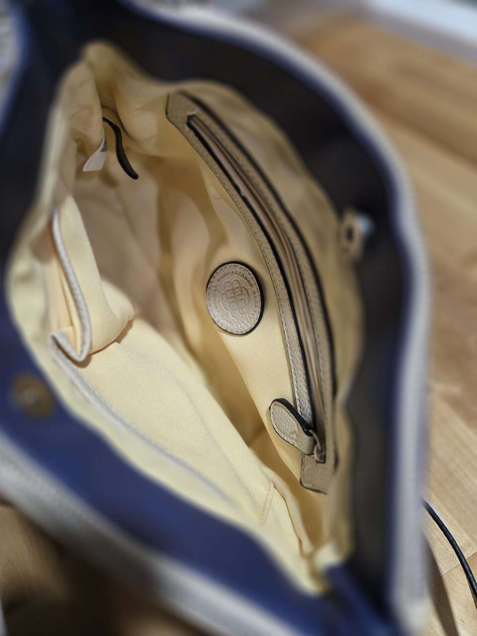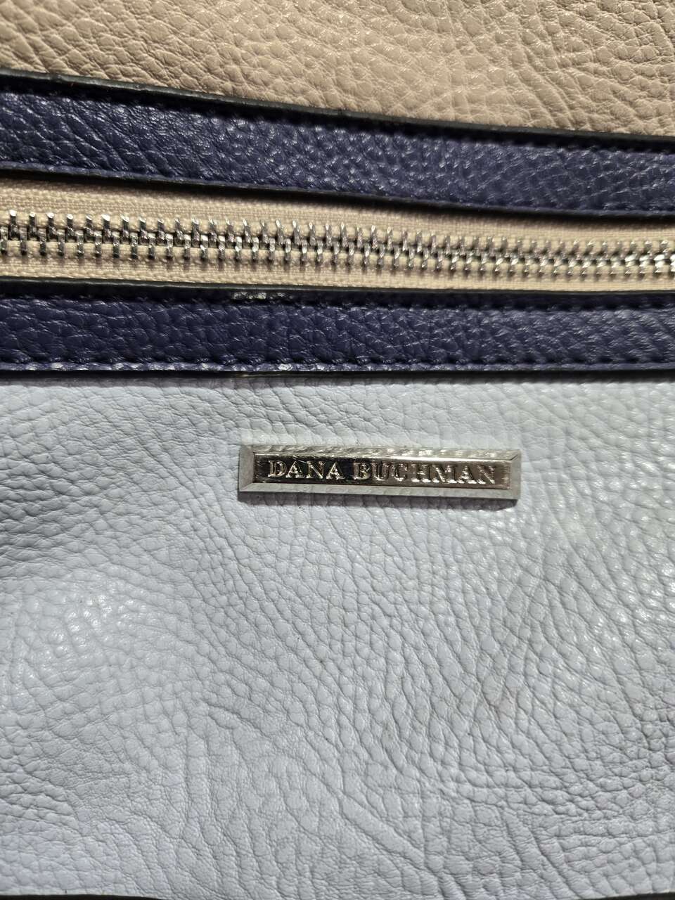 This Dana Buchman crossbody handbag is perfect for casual occasions. The exterior is made of faux leather in navy, tan, and beige colors with silver hardware accents. The bag has a zip closure and measures 11.5 inches in width, 8.5 inches in height, and 2.5 inches in depth. The crossbody strap is adjustable and beige in color. Inside, the bag has both inner and outer pockets for storage. The lining is made of yellow fabric and the bag is adorned with the Dana Buchman product line name. This medium-sized handbag is the perfect addition to any casual outfit and is sure to become a favorite.