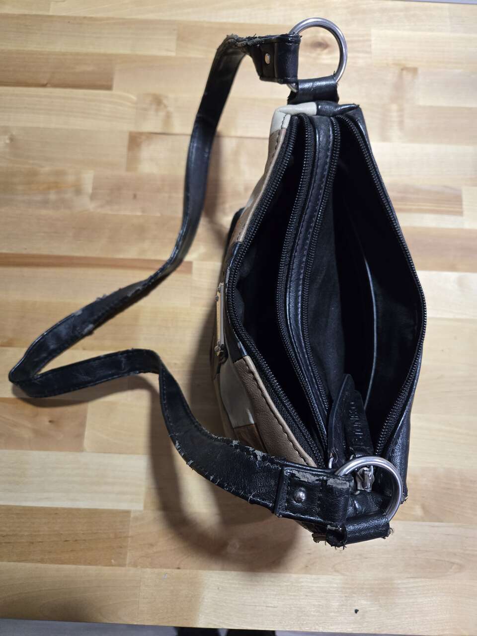 Wear on one top corner 1 inside zip pocket 2 inside pockets 1 outside zip pocket/ 1 pocket few pin holes in leather on patchwork, Bag Depth: 10" Material: Leather Bag Height: 10" Style: Shoulder Bag Bag Length: 13" Type: Handbags Strap Drop: 10"