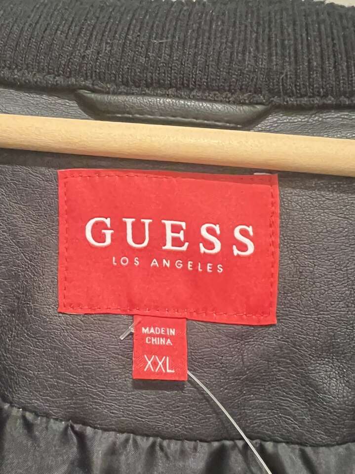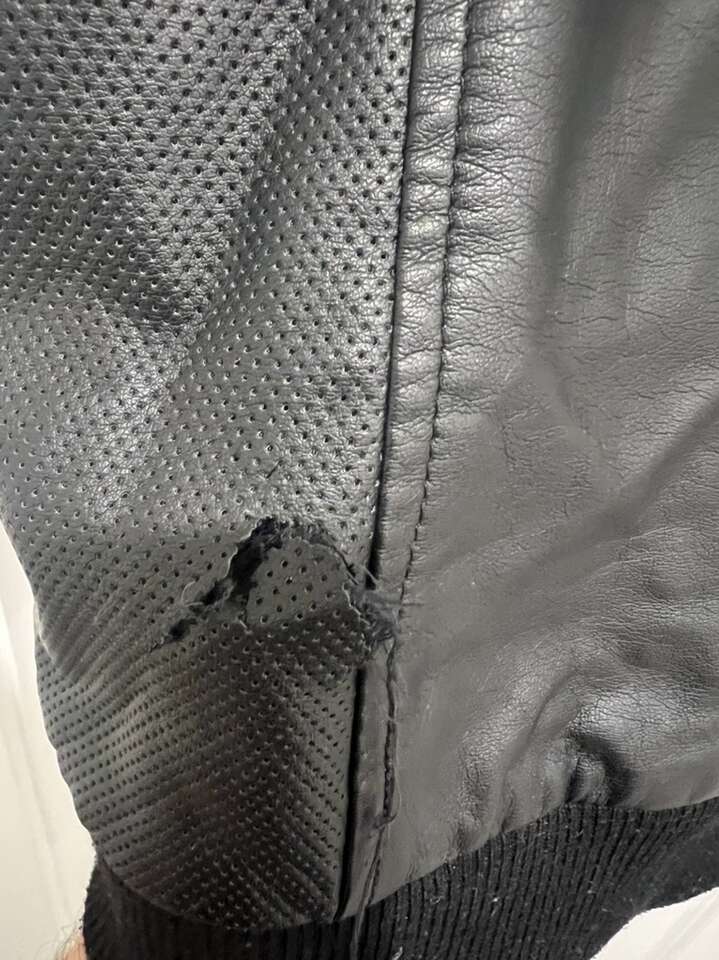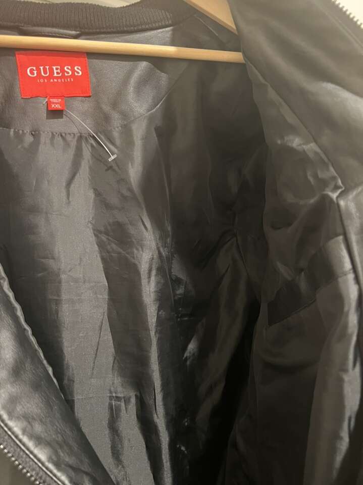 The jacket is in overall good conditions. Was worn less than a few times. Does have a small damage on the back bottom area as pictured. It’s size XXL but fits more like XL. It’s made of “vegan” leather. Originally was $150 in retail.