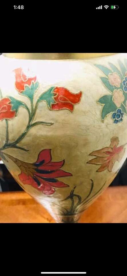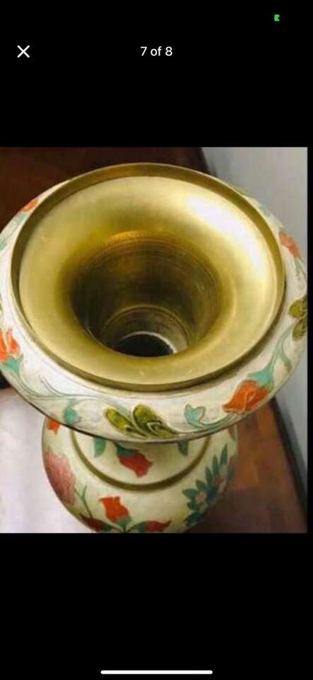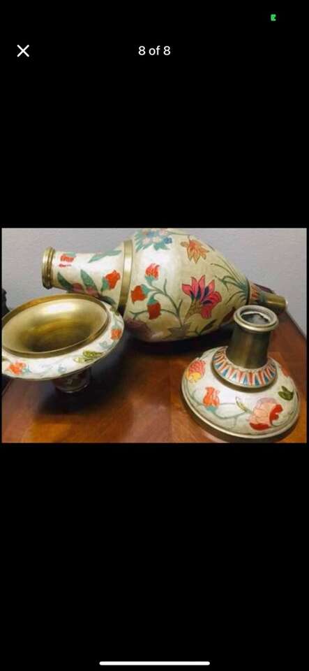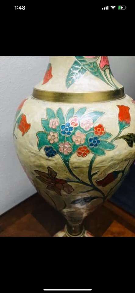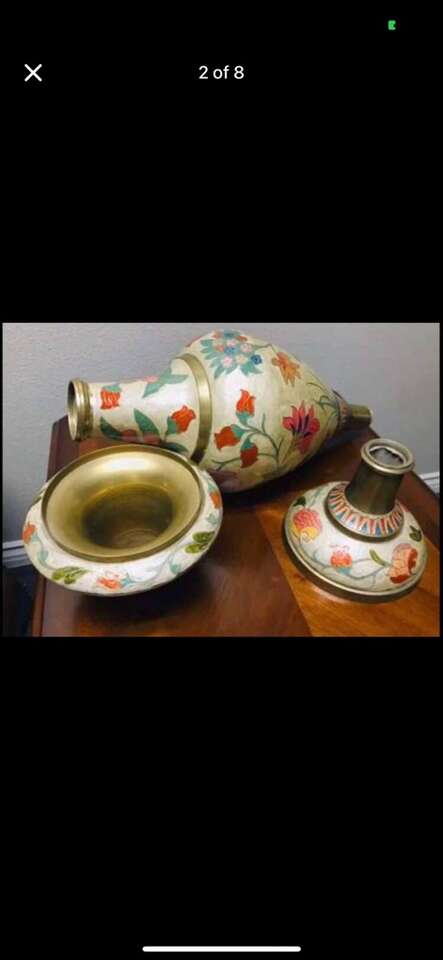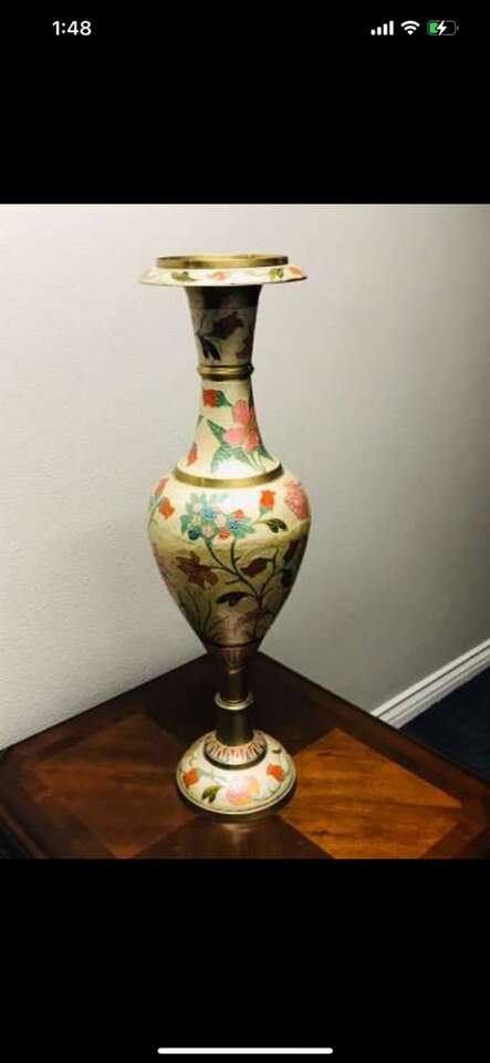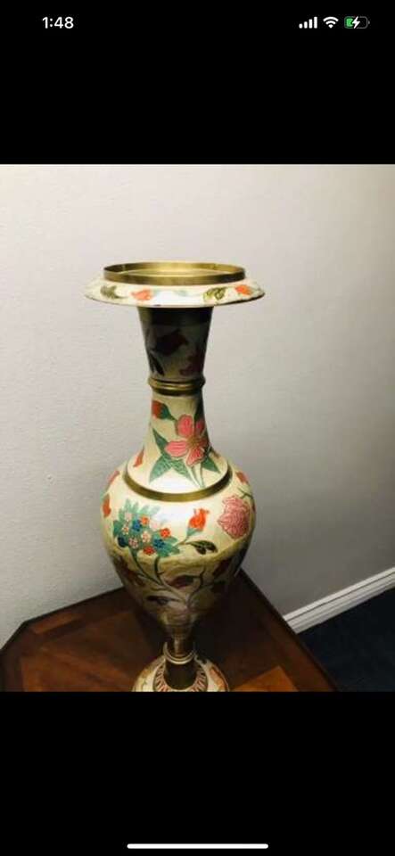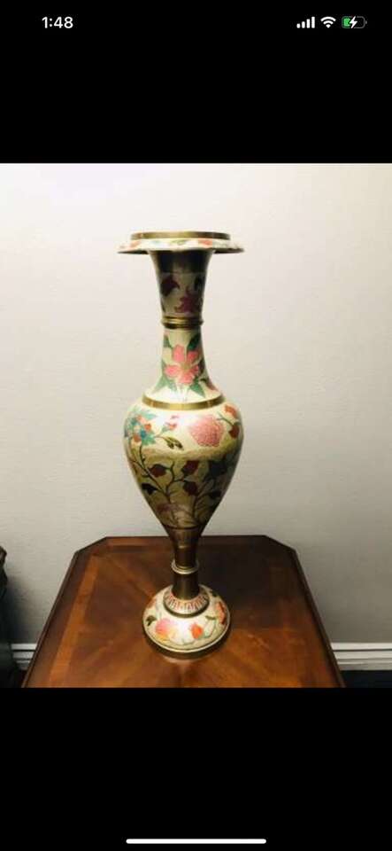 $2460! Rare Antique of Mid-Century Brass Enamel Very Large Vase. Reduced!!$2460 you can check on 1stdibs.com…One of a kind of Mid-Century palatial Indian brass urn or stand with Classic form and a brilliant combination of engraving and enamel, in the champlevé manner. Having removable lids which give these exotic works of art the duel purposes of either vessels or fern stands. Dimensions Height: 31 in. Diameter: 9 in. Style Moorish (In the Style Of) Materials and Techniques Brass & Enamel Place of Origin India Period 20th Century Date of Manufacture circa 1960 Condition Good Wear consistent with age and use.