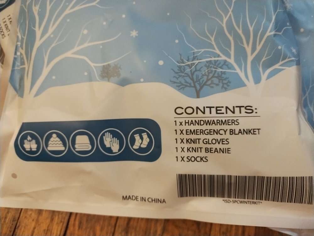 Winterizer Warming Kit, includes 1 Handwarmer, 1 emergency Blanket, 1 pair of knit Gloves, 1 knit Beanie and 1 pair of Shocks. Perfect for your Car just in Case. $20 for all three or $8 a piece.