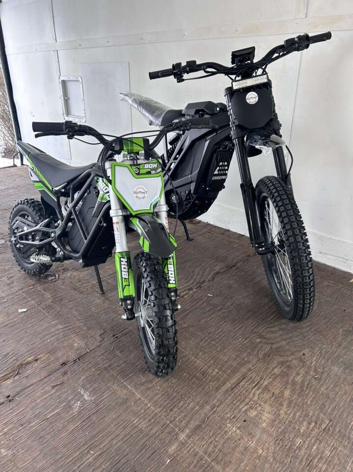 ZelleEBox 2.0 and 1.6 bikes in stock ready to go. 6 hour run time. 32 mph. Adjustable speed and throttle knobs. Tons of fun for all ages. E box is the go to brand in the pit bike and mini bikes. All electric so maintenance is a breeze.