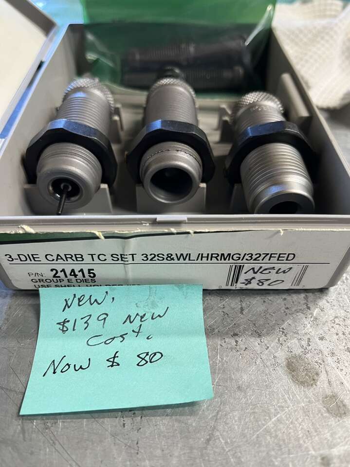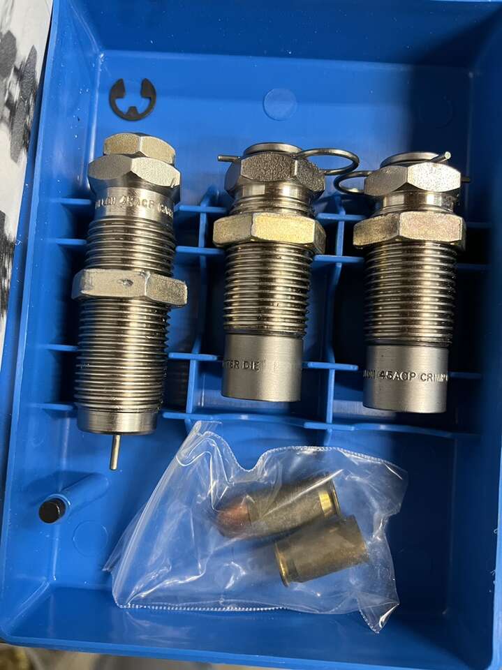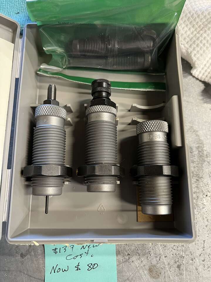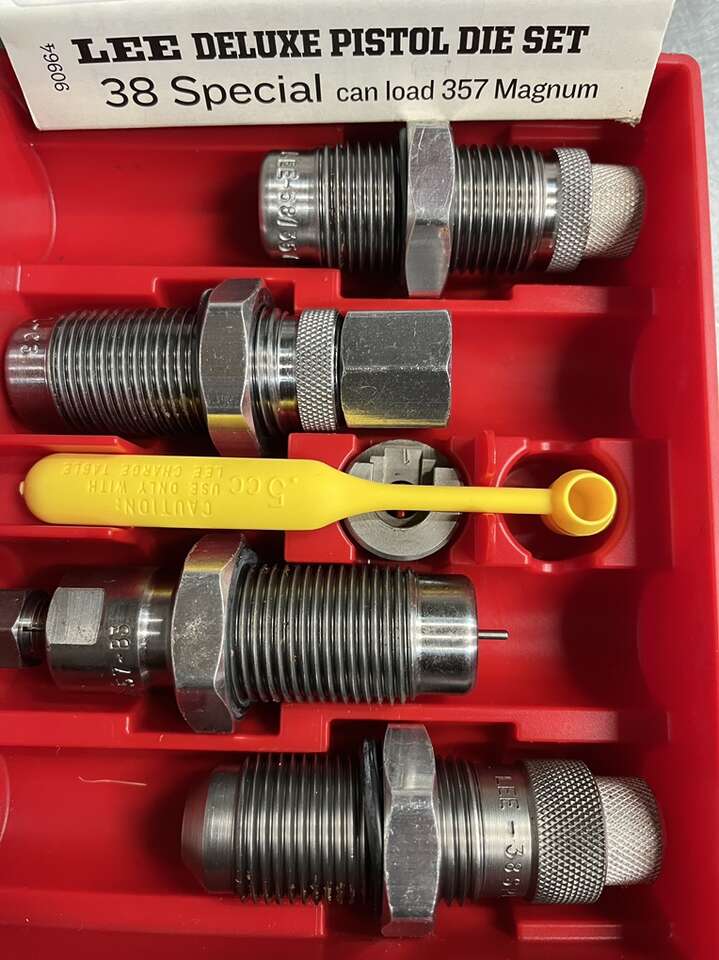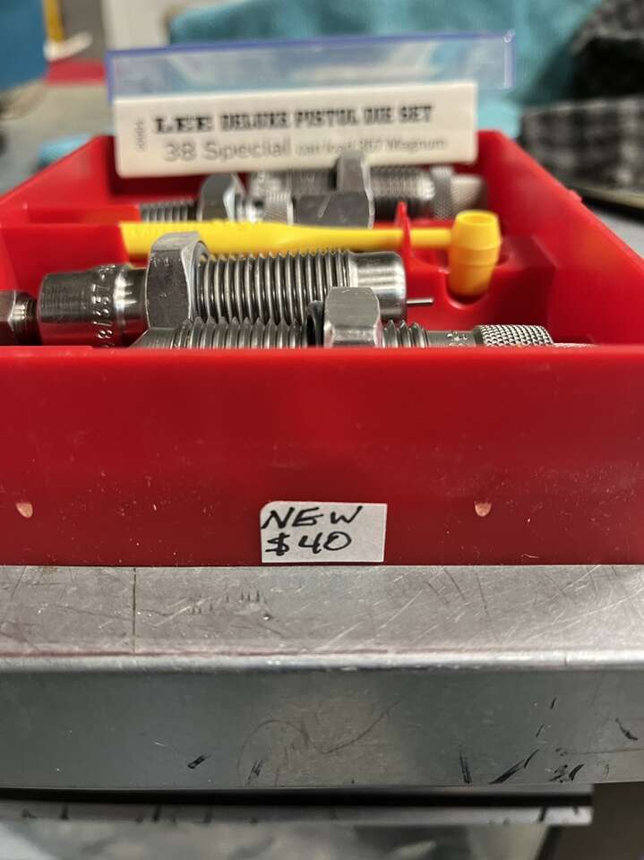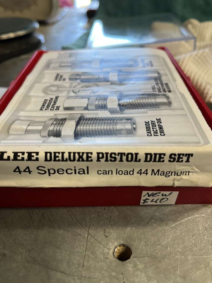 Lee 38/357 mag new 4 die set for $40… Lee 44 sp/mag as new 4 die set for $40… Dillon 45 acp/gap set for $90… 10/40 Dillon for $90. LOTS of other die sets available. Brass, bullets, powder, equipment and primers also available. I will ship for postage costs. Thanks, Joe.