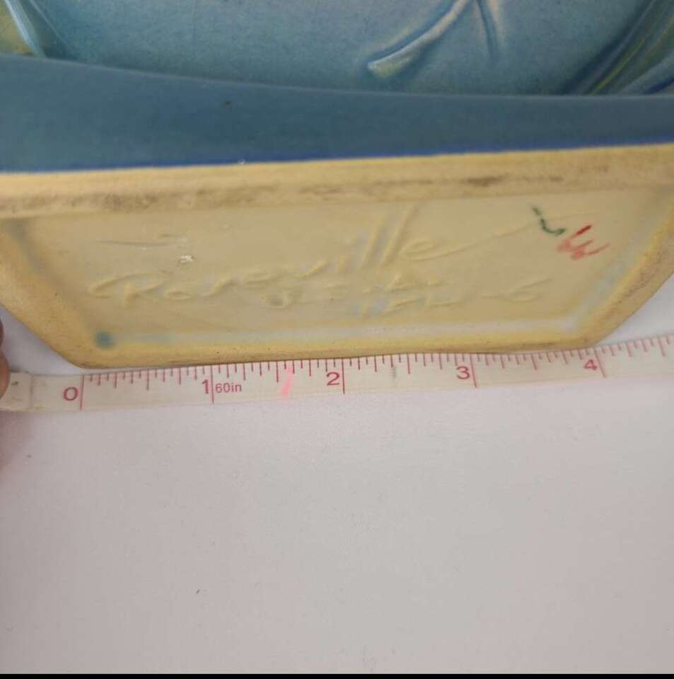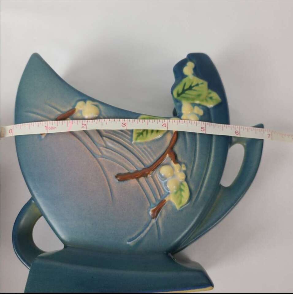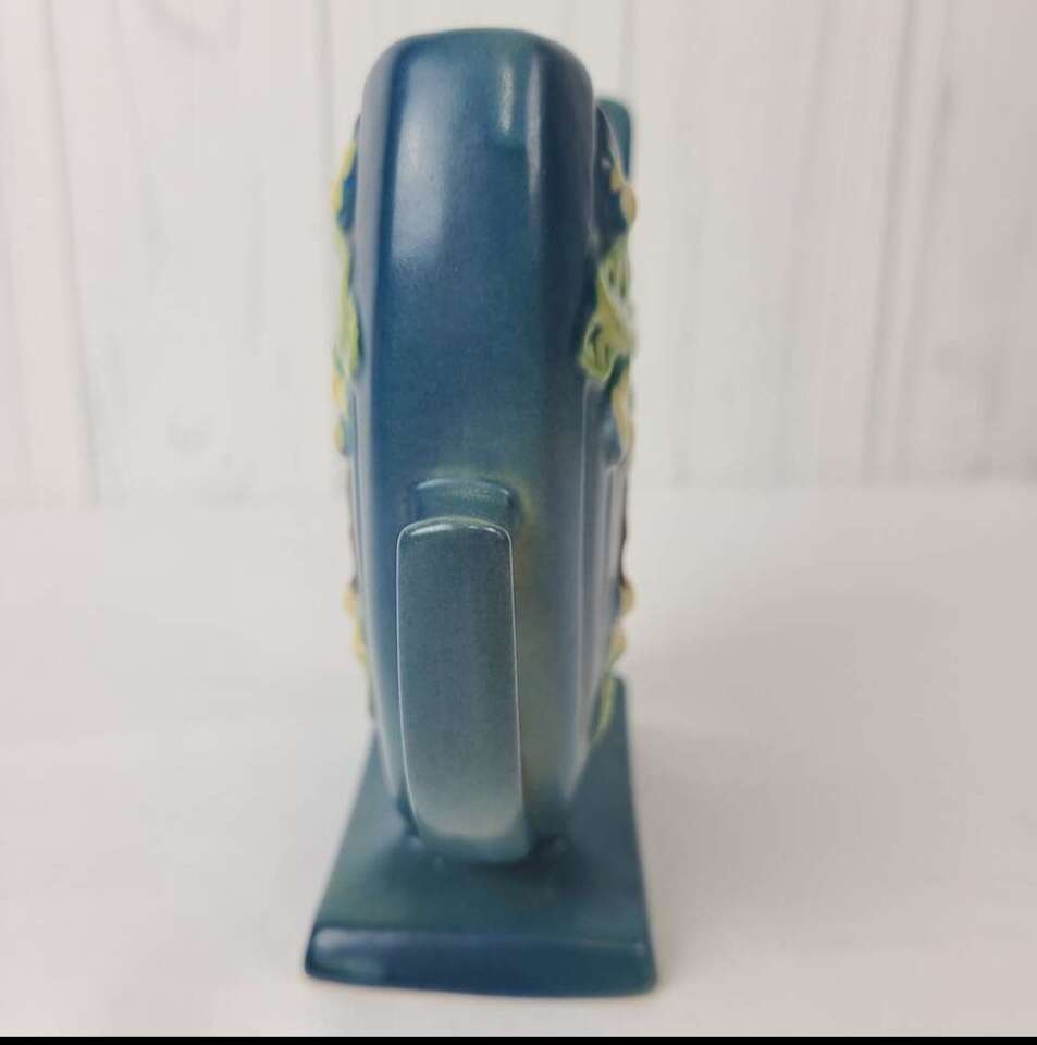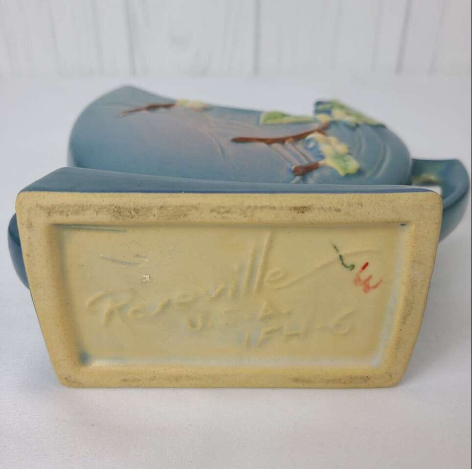 ZelleRare Roseville Pottery Blue Snowberry IFH-6 Pillow Vase from 1947. This antique vase features an embossed floral pattern with blue snowberry flower petals and includes the signature maker's mark for Roseville Pottery.