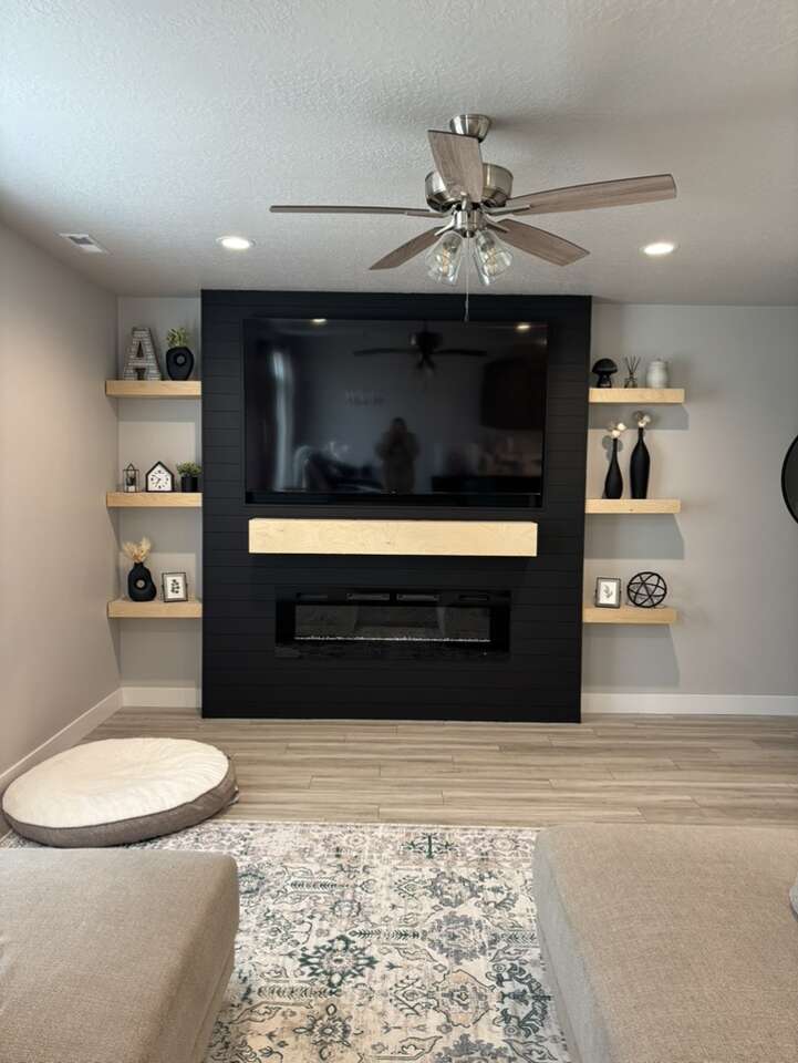 I have this custom built birch mantel ready to go. It measures 60x 7 5/8 x 7 5/8 (length x width x depth) I can stain any color in the photos for you. I can build custom sizes if you need as well. I can also build the floating shelves and the media walls that are in the photos.