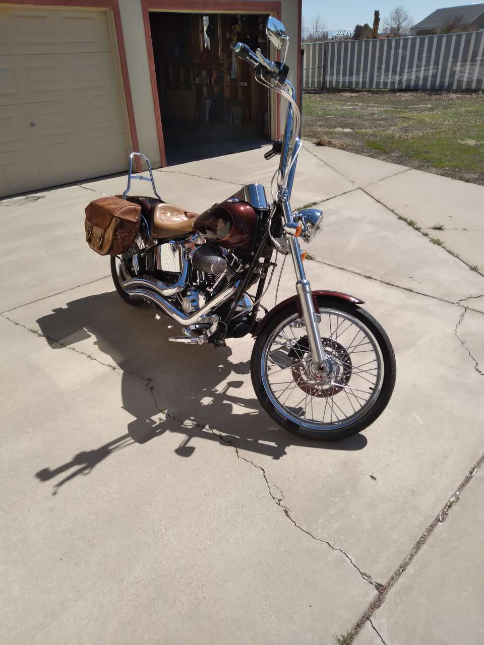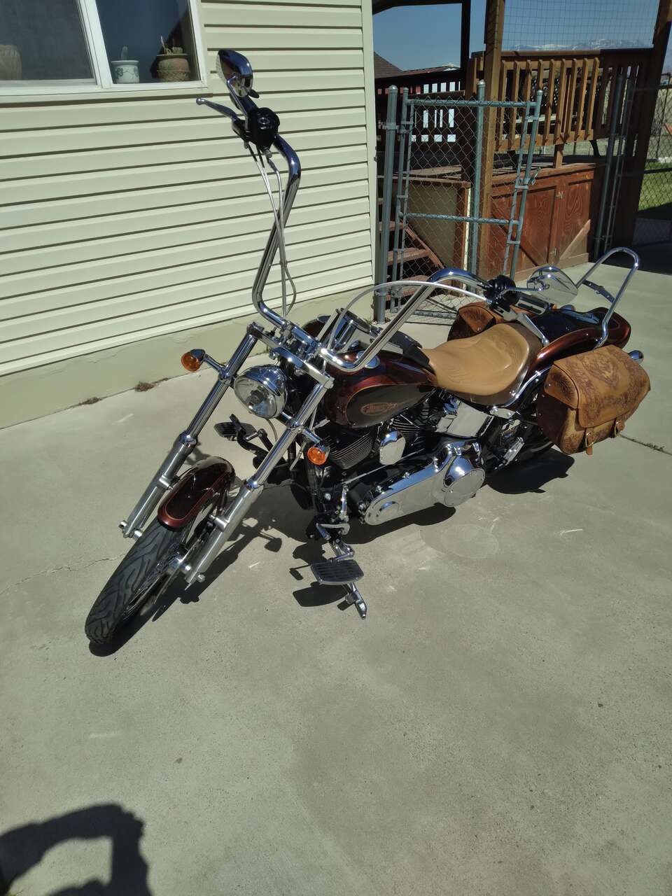 Low miles 42K. Many additions, 16" apes w/braided lines vance/hines pipes w/thunder city baffles, screaming eagles intake HD super tuner software, Corbin solo seat plus new two up seat. High quality detachable windshield, sissy bar mount luggage platform, hand tooled leather bags over factory hard bags. extremely well maintained always garaged. this bike has been babied all its life.