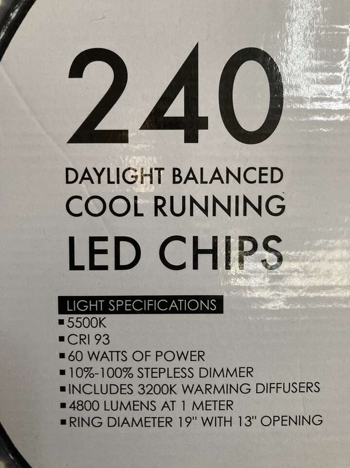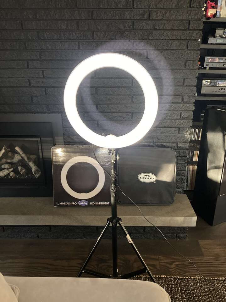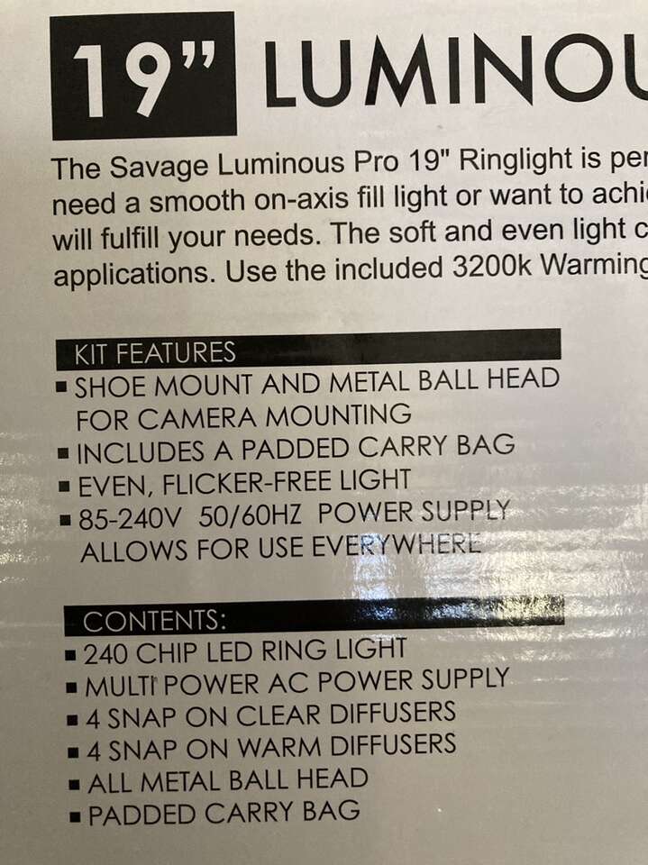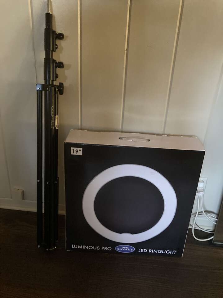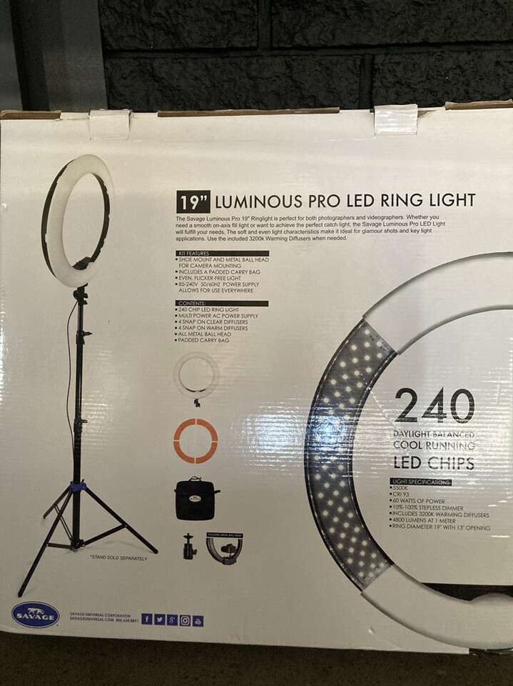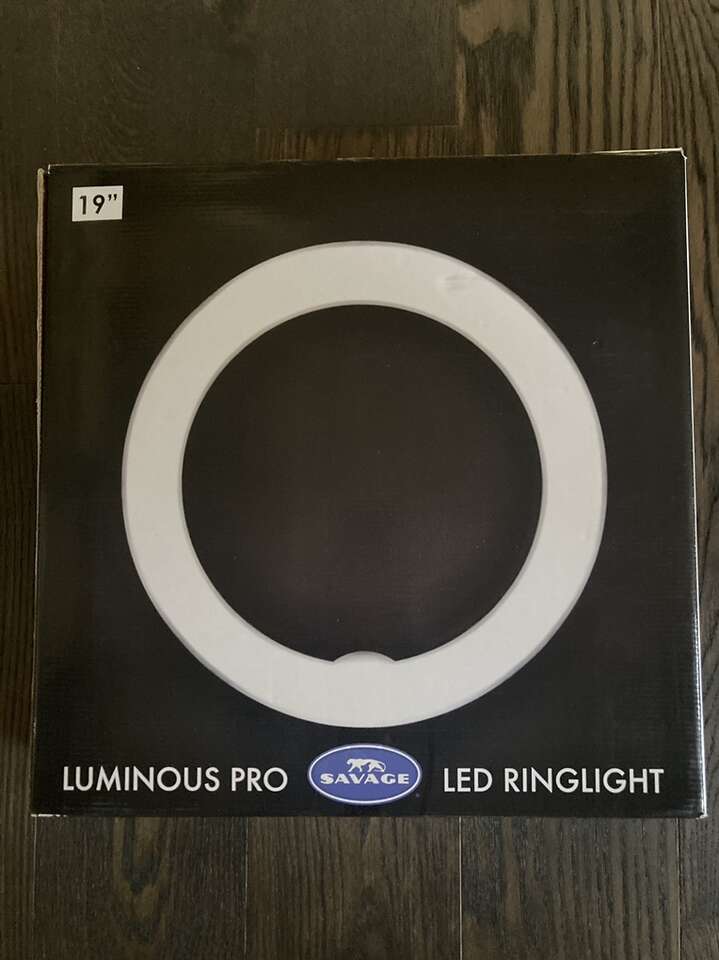 VenmoSavage Luminous Pro 19 96W Bi-Color LED Ringlight Plus, 5300 Lumens, 95 CRI One owner EUC* See photos of back of box for specs Includes: original box, travel bag, tripod, 4 snap on clear/white diffusers*, 4 snap on warm diffusers (never used) *two of the clear/white diffusers have been taped on as they don't snap on properly The Savage Luminous Pro 19 Ringlight Plus is a versatile light source, great for both photography and video applications. Whether you need a smooth on-axis fill light or want to achieve the perfect catch light in your model's eyes, this low-heat, noiseless LED light will fulfill your needs. The soft, even light characteristics make it ideal for glamour shots and key light applications, smoothing out skin imperfections and enhancing the overall look of your model's skin tone. The color temperature of the light can be adjusted from 3200K to 5500K and anywhere in between and power level from 10% to 100%. The diffused front makes close-in shots easier on the subject's eyes. A large rear LCD display allows for easy adjustments of power and color temperature. The included remote control accessory allows the user to control the light settings from anywhere on set, which is especially useful for users operating the light from the front, for vlogging or self-portraits. Light is adjustable with a dimmer switch Measures 19 diameter with 13 opening 480 Daylight balanced, cool-running LED chips CRI: 95 5300 Lumens at 1m at 4300K 4300 Lumens at 1m at 3200K 3600 Lumens at 1m at 5500K Adjustable color temperature Shoe mount and metal ball head with removable shoe for camera mounting Even, flicker-free light 75 minutes of run time at full power (5500K, 3200K) with included batteries Dual voltage power supply (110-240v input-14.5v output) Rear LCD readout indicates power level, Kelvin temperature, battery level, group and channel settings Located in East Millcreek Venmo or cash