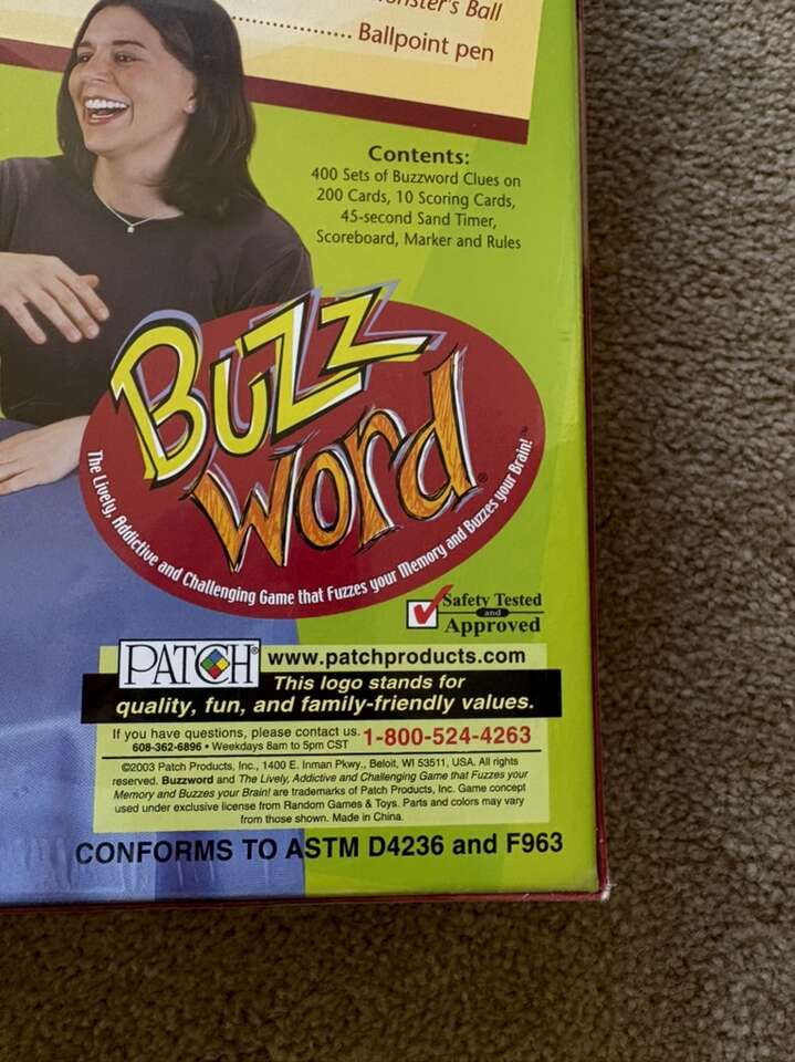 NEW (sealed in plastic) Buzz Word: The lively, addictive and challenging game that fuzzes your memory and buzzes your brain! Patch products, 2003. 4+ players, ages 10+. New, unopened condition. Text only. Cash or Venmo.