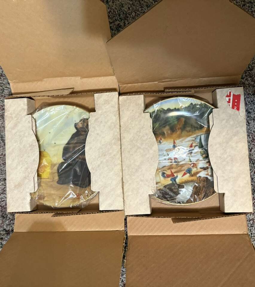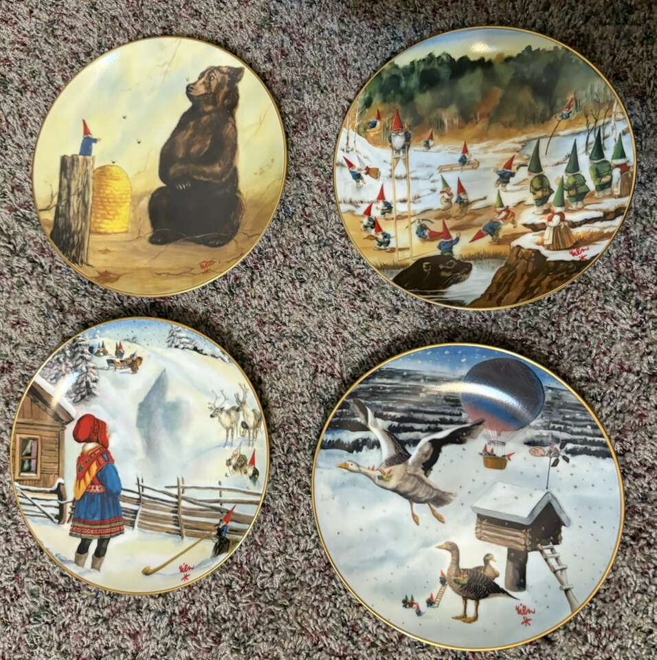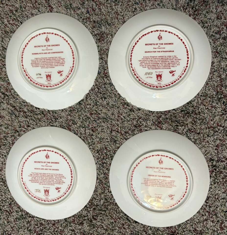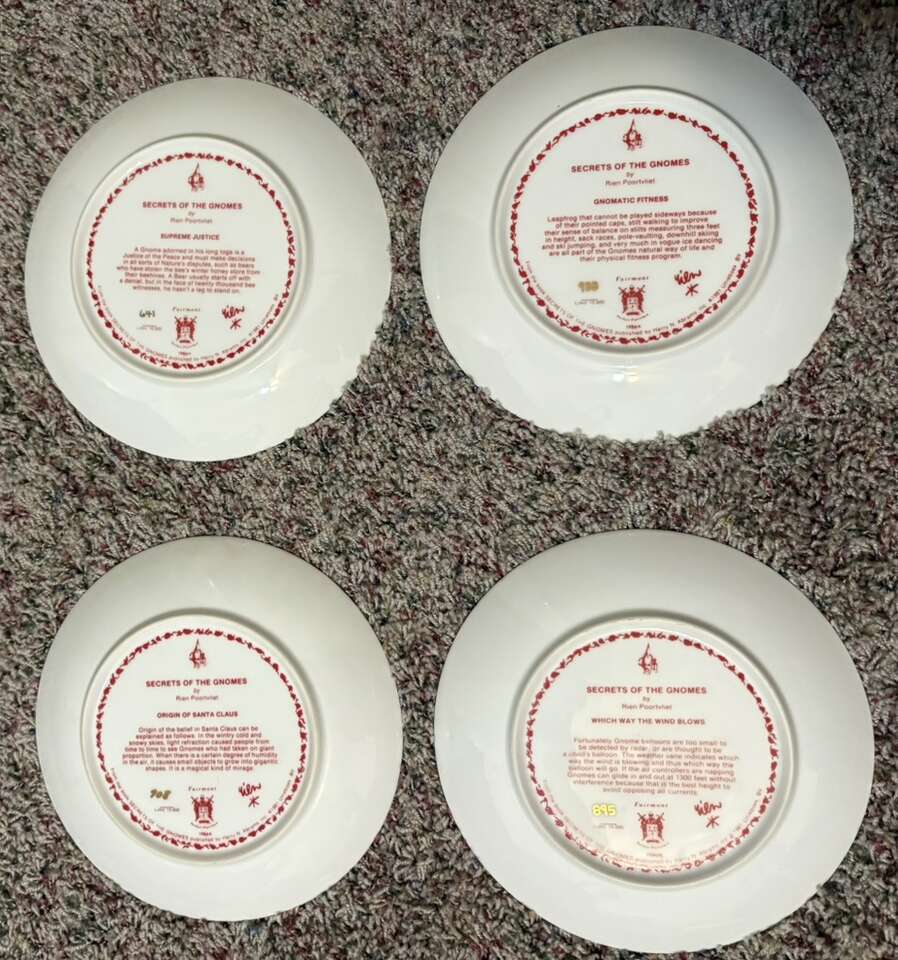 VenmoThis is a rare set of 8 porcelain collector plates featuring the Legends of the Gnomes theme by artist Rien Poortvliet. The plates are round with a diameter of 8.5 inches. They were manufactured in the 1980s and showcase whimsical gnome illustrations. These decorative plates are perfect for any occasion and would make a unique addition to a collector's display.