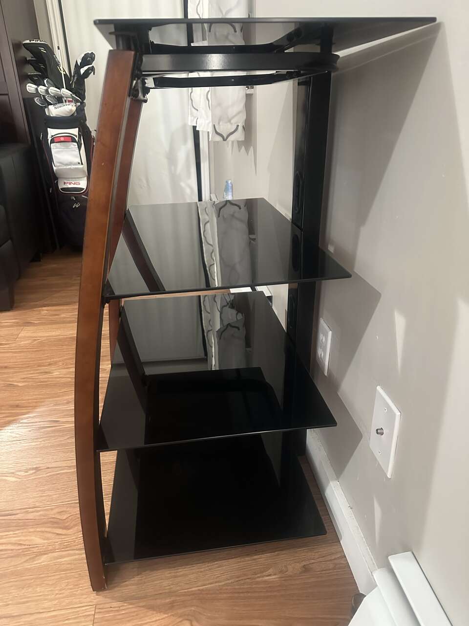 VenmoGlass and cherry wood small entertainment center, perfect for keeping TV with DVD player or use it for any other purposes. Its pretty new hardy used. dont need it have two.