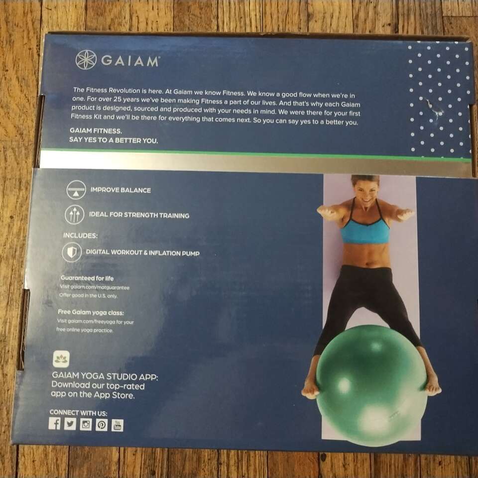 Gaiam Balance Ball 65cm for heights 5'6"-5'11". Exercise your Abs, back, glutes, hips, arms and more. This Ball cones with the Pump all is still wrapped in the Plastic Bag.