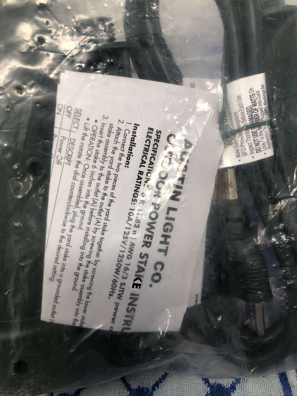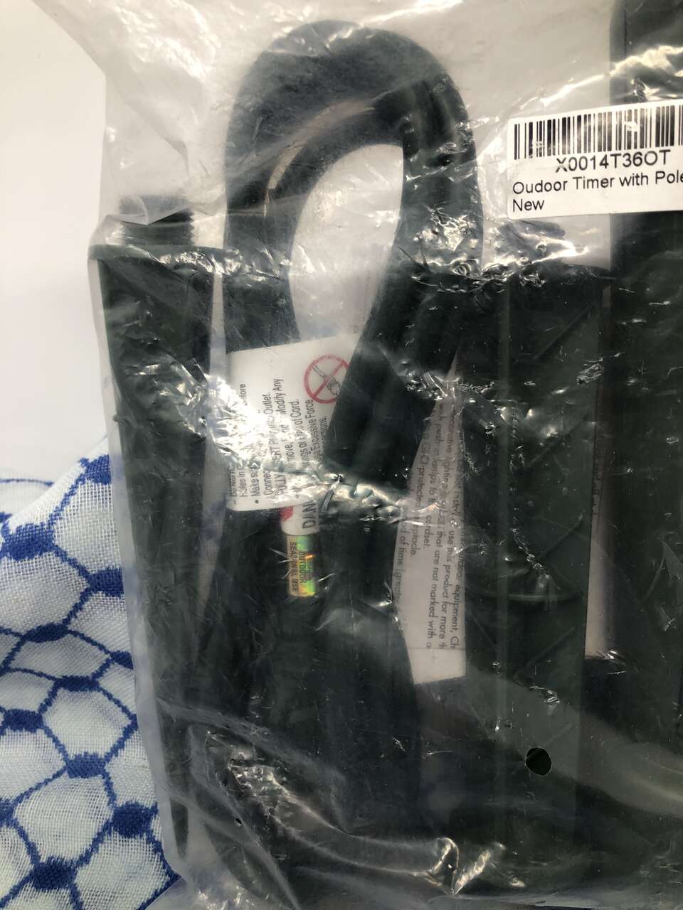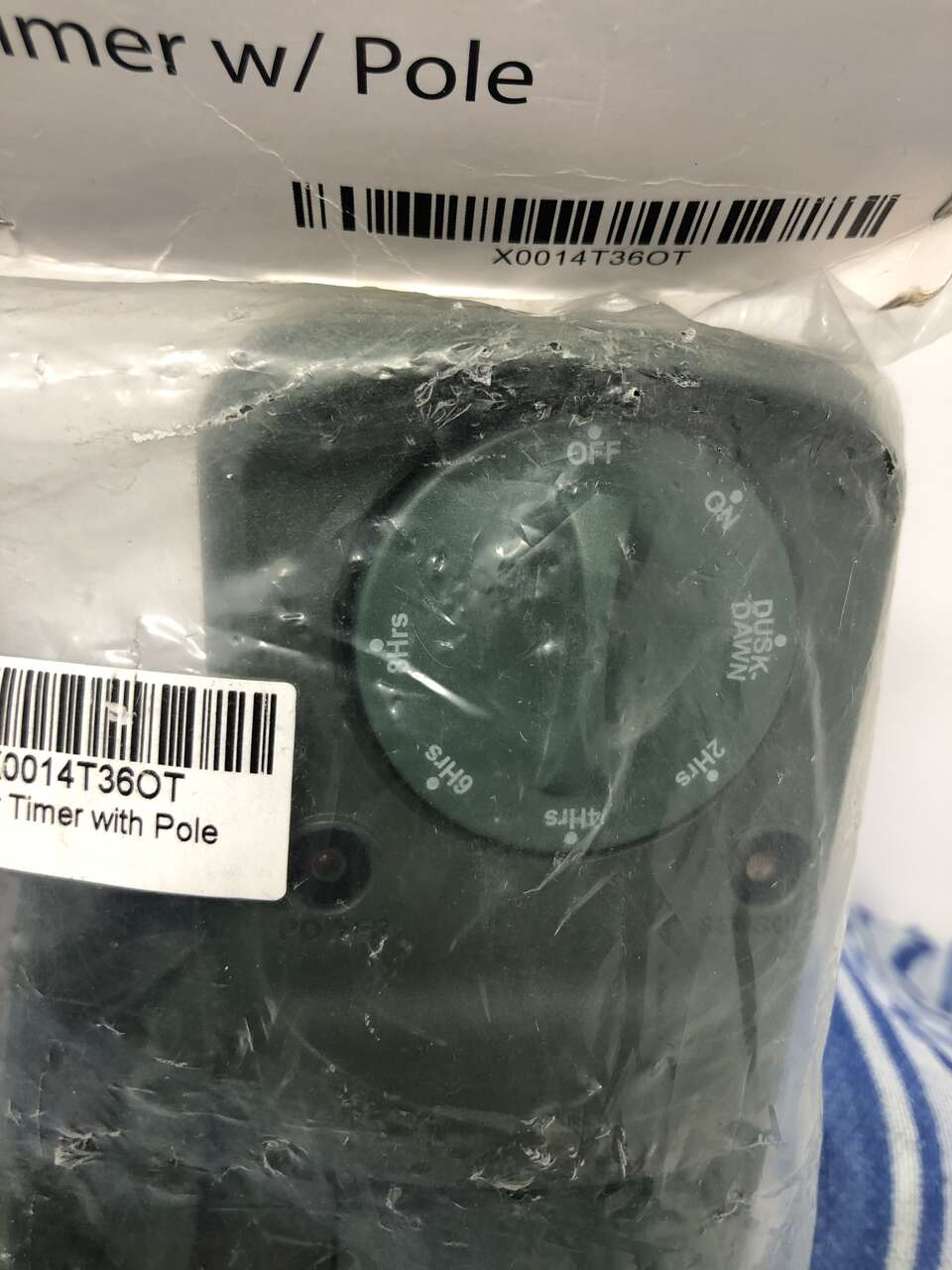 Still sealed and in original packaging. It comes with a stake to keep the timer vertical, a 6ft power cord, 3 outlets, and a twist timer. The timer has the following settings: OFF, ON, DUSK-DAWN, 2hrs, 4hrs, 6hrs, and 8hrs.