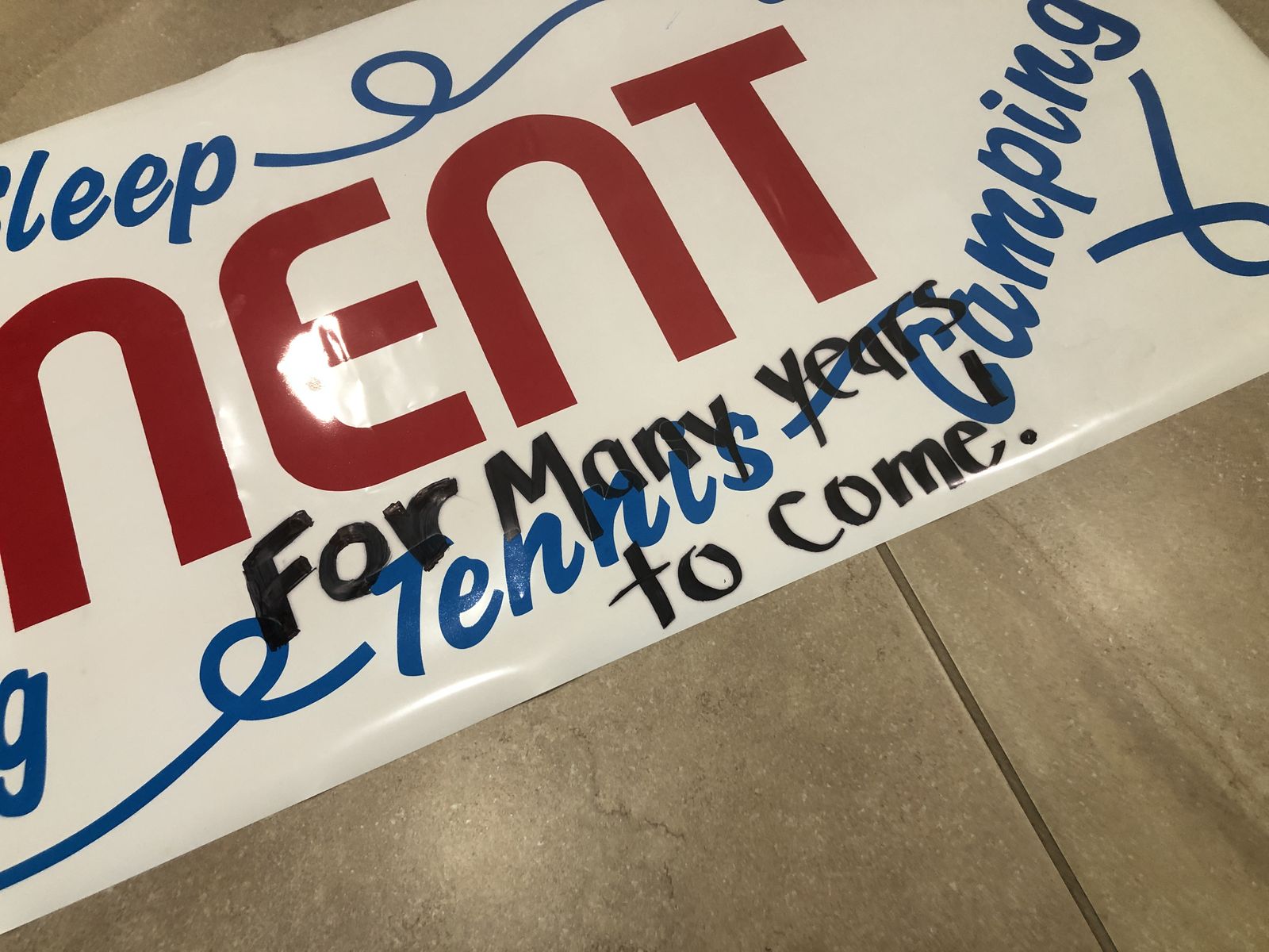 The banner does have writing, "for many years to come" shown in photos