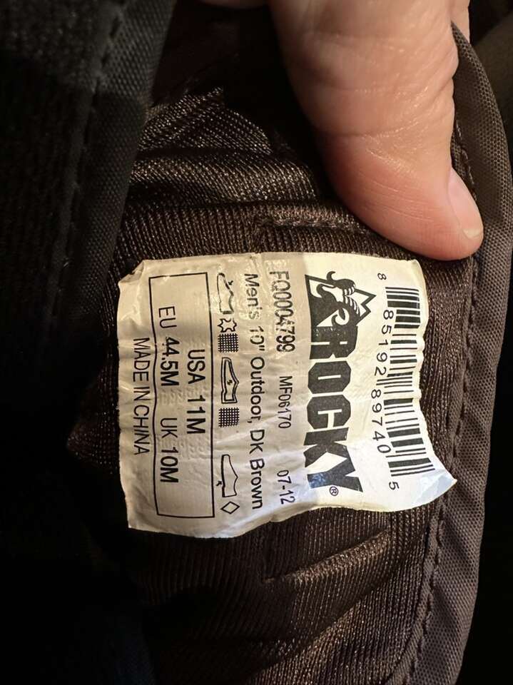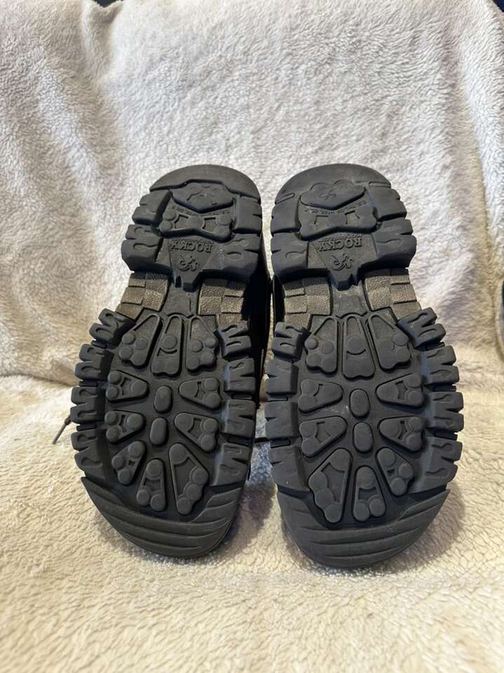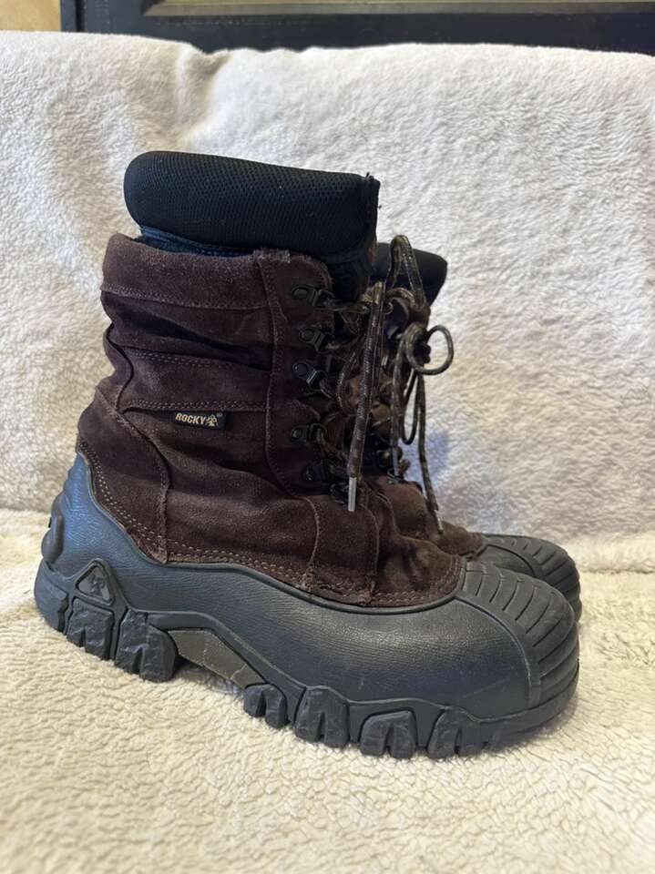 Rocky men’s size 11 winter boots with brown leather uppers and black rubber foot bed with removable liners and they lace up the front. These are in good condition, see photos for details. I take cash or Venmo, but cash is preferred.