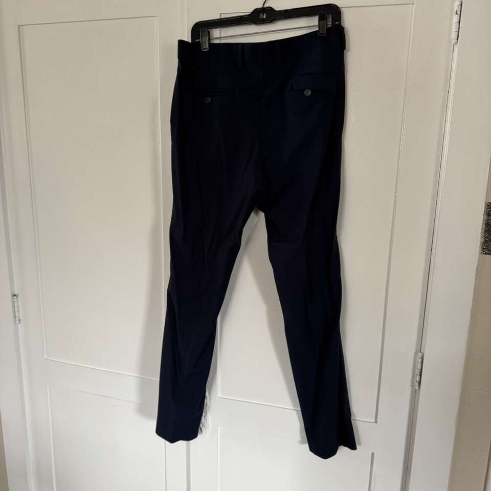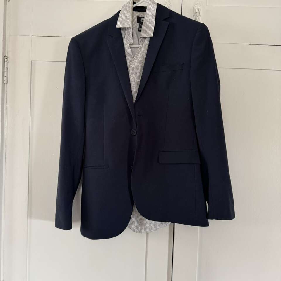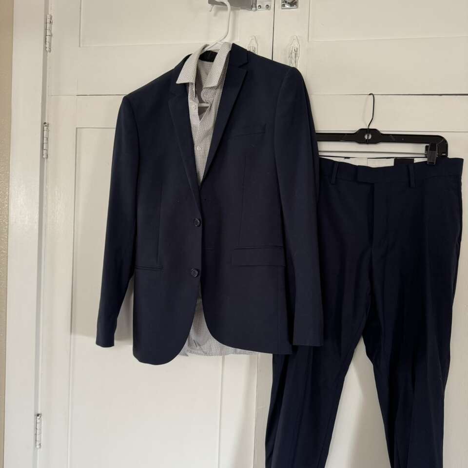 H & M Navy Blue Men’s Suit Shirt S/M Pants 33R Does have some staining on the collar