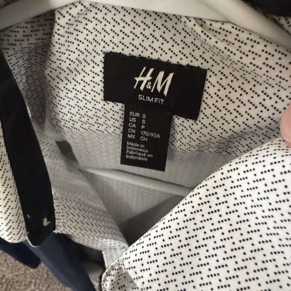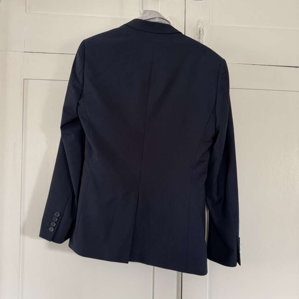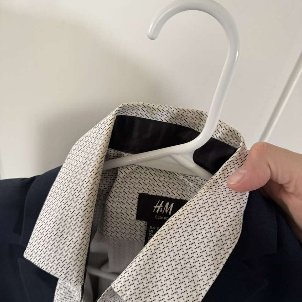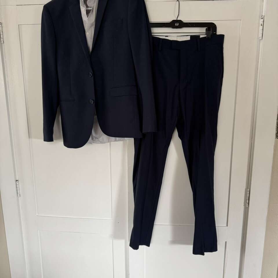 H & M Navy Blue Men’s Suit Shirt S/M Pants 33R Does have some staining on the collar